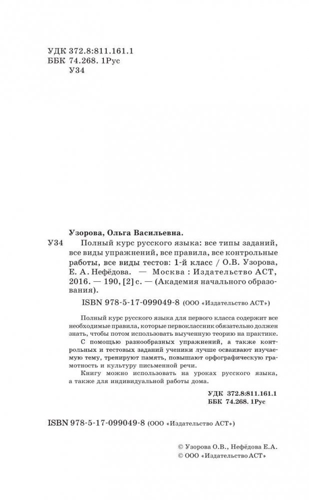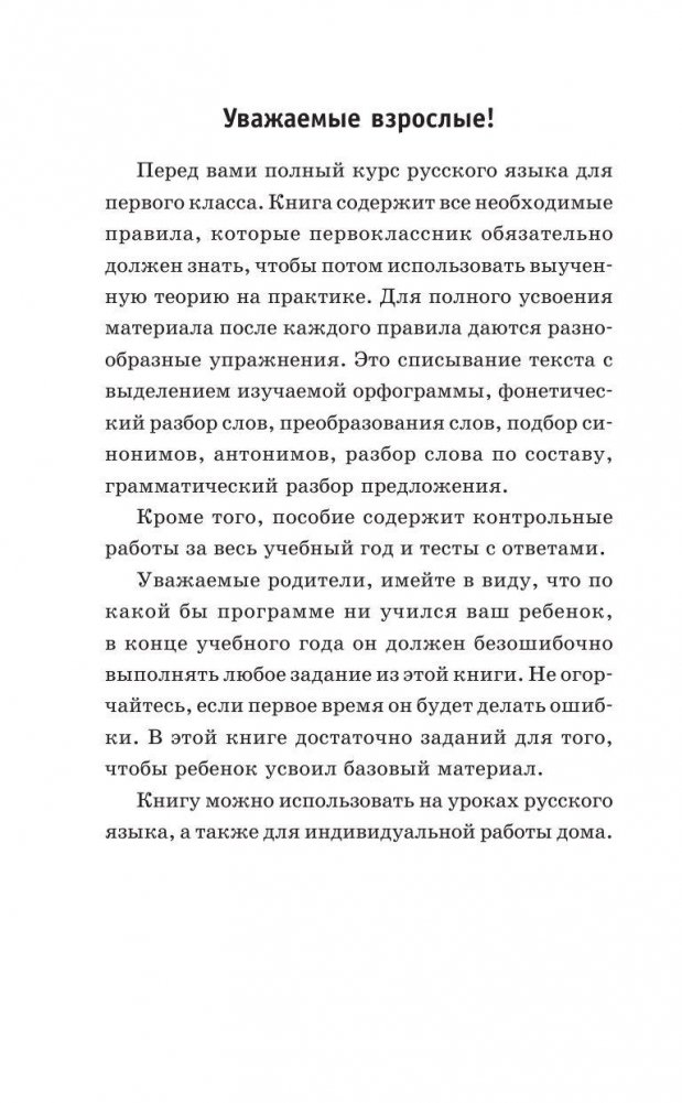 Полный курс русского языка для первого класса содержит все необходимые правила, которые первоклассник обязательно должен знать, чтобы потом использовать выученную теорию на практике. С помощью разнообразных упражнений, а также контрольных и тестовых заданий ученики лучше осваивают изучаемую тему, тренируют память, повышают орфографическую зоркость и культуру письменной речи. Книгу можно использовать на уроках русского языка, а также для индивидуальной работы дома.