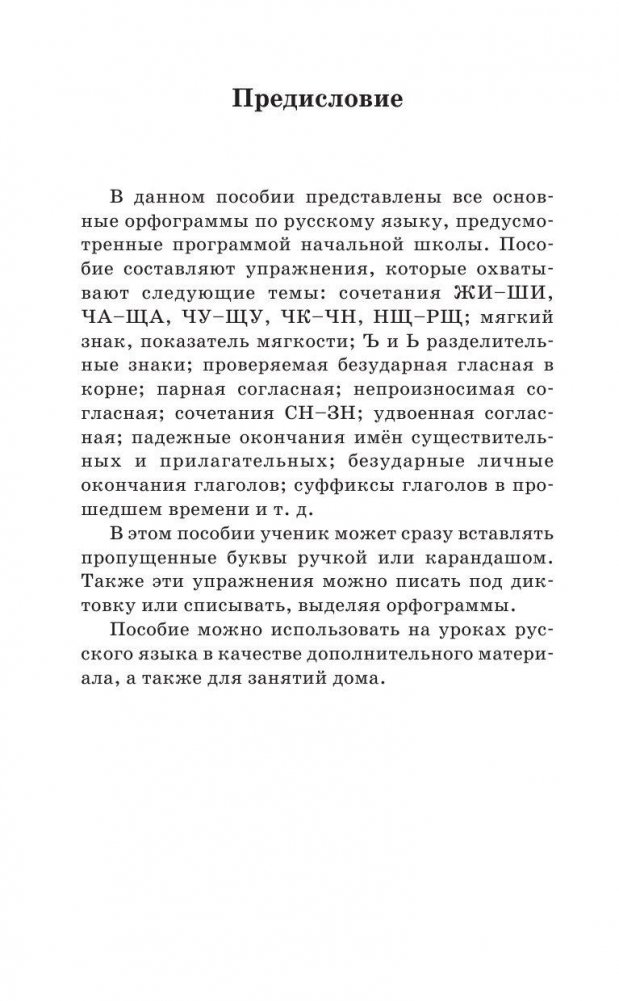 Данное пособие содержит материалы по русскому языку для учащихся 1-5 классов, позволяющие усвоить входящие в программу начальной школы навыки правила орфографии и навыки грамотного письма. Пособие рекомендуется к использованию на уроках русского языка и для индивидуальной и внеклассной работы.