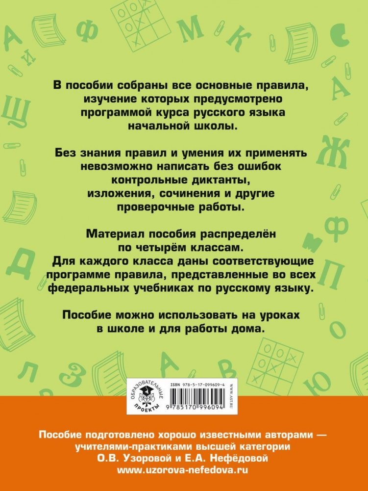 В пособии собраны все правила, необходимые для автоматического грамотного письма, представленные во всех федеральных учебниках по русскому языку 1-4 классов. Без знания этой теории невозможно написать без ошибок различные проверочные работы. Пособие поможет учителям и родителям проверить качество знаний детей, а ученикам подготовиться к контрольным работам и мини-ЕГЭ.