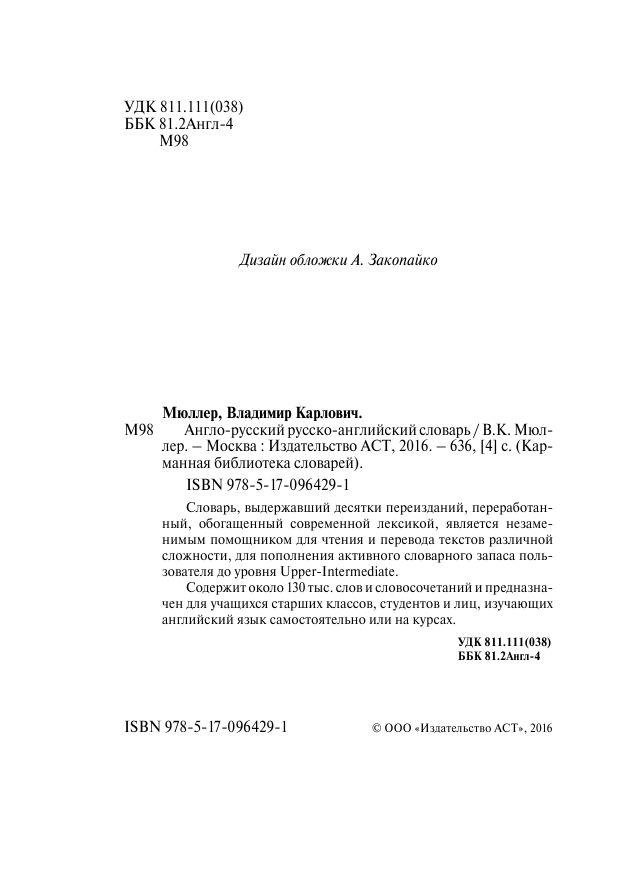 Словарь, выдержавший десятки переизданий, переработанный, обогащенный современной лексикой, является незаменимым помощником для чтения и перевода текстов различной сложности, для пополнения активного словарного запаса пользователя до уровня Upper-Intermediate. Предназначен для учащихся старших классов, студентов и лиц, изучающих английский язык самостоятельно или на курсах.