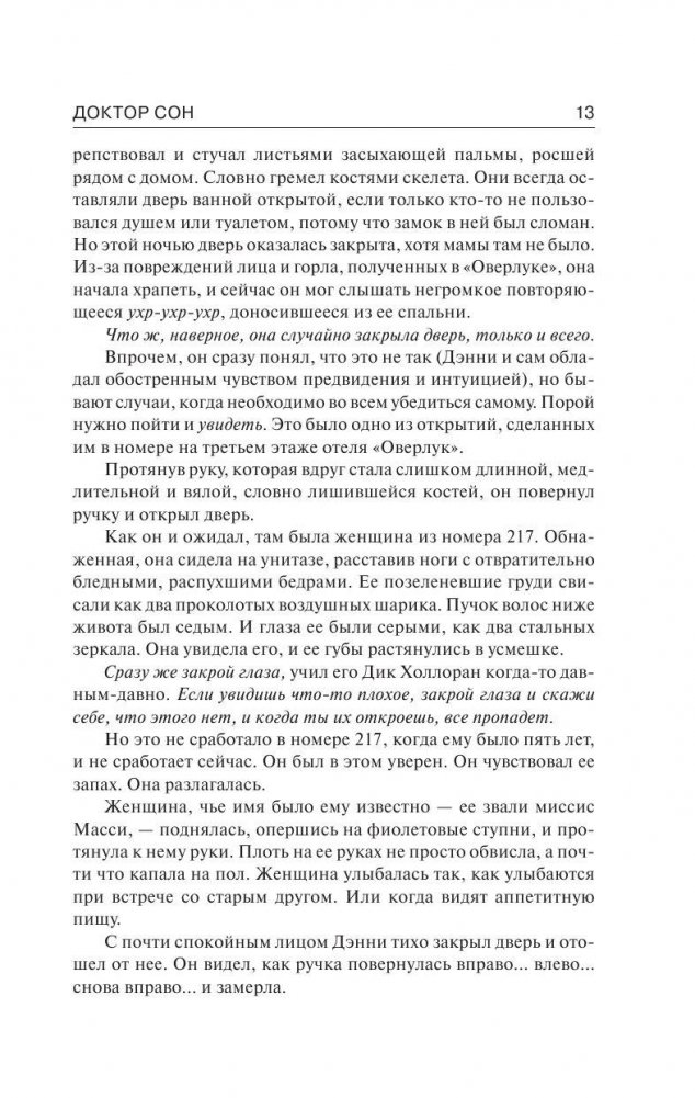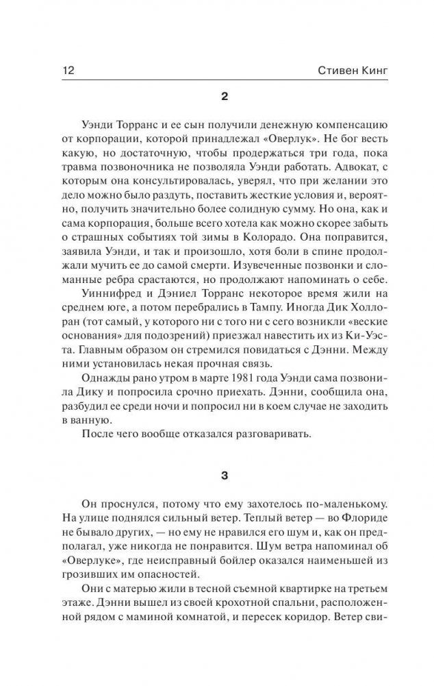 Дэнни Торранс, сын писателя, уничтоженного темными силами отеля «Оверлук», до сих пор тяготится своим необычайным даром. Ведь способность «сиять» вновь и вновь напоминает ему о трагических событиях, пережитых в детстве и едва не сломавших ему жизнь. На плаву Дэнни поддерживает лишь работа в хосписе, где его способности помогают облегчить пациентам мучительную боль. Но однажды к Дэну приходит двенадцатилетняя девочка Абра, которая излучает «сияние» невероятной, немыслимой силы. И девочке этой угрожает смертельная опасность – на нее объявлена настоящая охота. Дэн Торранс – единственный, кто может ее спасти…