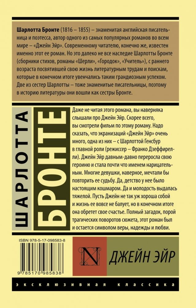 Даже не читая этого романа, вы наверняка слышали про Джейн Эйр. Скорее всего, вы смотрели фильм по этому роману. Надо сказать, что экранизаций «Джейн Эйр» очень много, одна из них — с Шарлоттой Генсбур в главной роли (режиссер – Франко Дзефирелли). Джейн Эйр давным-давно переросла свою героиню и стала почти что именем нарицательным. Многие девушки, наверное, мечтали бы повторить ее судьбу. Да, детство у нее было настоящим кошмаром. Да и молодость выдалась тяжелой. Пусть Джейн не так уж хороша собой, и жизнь ее вовсе не балует, но в конечном итоге она обретет свое счастье. Полный загадок, порой трагических поворотов сюжета, этот роман был и остается символом веры, надежды и любви.