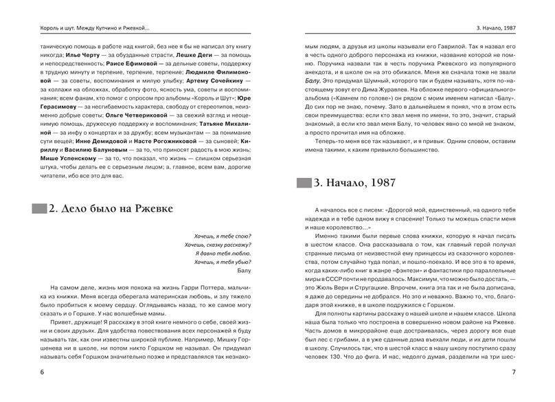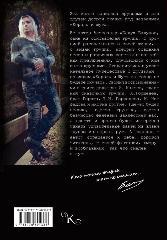 Эта книга написана друзьями и для друзей доброй сказки под названием «Король и шут». Ее автор Александр «Балу» Балунов, один из основателей группы, с иронией рассказывает о своей жизни, о жизни группы, истории создания песен и различных веселых и волшебных приключениях, случившихся с ним и его друзьями. Отправившись в увлекательное путешествие с друзьями по мирам «Король и Шут» вы точно не будете скучать. Своими воспоминаниями в книге делятся: А. Князев, главный сказочник группы, А. Горшенев, брат Горшка, Т.И. Горшенева, М. Нефедова и многие другие. Где-то будет весело, где-то грустно, где-то безумство фантазии захлестнет вас, а где-то и просто будет интересно узнать удивительные факты из жизни группы из первых рук. А главное – автор обращается к тебе, дорогой читатель, к твоей фантазии, юмору и воображению, так что смелее в путь!