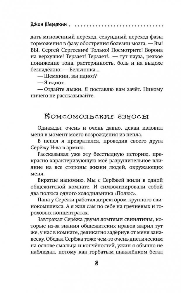 «Очень многие в последнее время стали задавать мне вопросы, связанные с родом моей деятельности. Для меня такое любопытство кажется странным. Люди не верят, что чтение псалмов на паперти взаправду может кормить! Любой Шерлок Холмс может подойти ко мне, хрустя пустыми ампулами с семипроцентным раствором под ботинками на пуговицах, и сразу же догадаться, кто я такой и чем зарабатываю себе на кусок горького хлеба и кружку дождевой воды. Раз в тельняшке – значит, моряк. Деревянная нога, подсыхающая у камина, говорит о том, что моряк я не очень хороший, но с богатым прошлым, скорее всего боевым. Где у нас была война последний раз? Значит, боевой моряк из Кандагара. Любит сидеть на стульях верхов, значит, кавалеризмом занимается. Боевой моряк-кавалерист из Кандагара. Часто матерится. Известное дело, гуманитарии. Татуировка «Саша» не тыльной стороне ладони помогает понять, что зовут меня Саша. А сердце, пронзенное стрелой, под синим именем – что я очень эгоистичный, самовлюбленный Саша… Я люблю, когда интрига». Джон Шемякин.
