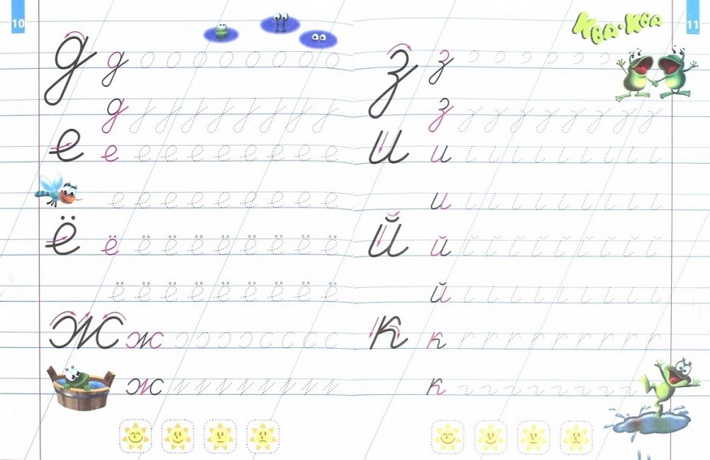 Эти комплексные прописи помогут ребёнку в игровой форме развить зрительное восприятие, внимание, мелкую моторику и координацию движения руки. Чтобы малыш не уставал, графические элементы даны в увеличенном виде, а на разворотах расположены забавные рисунки, связанные с выполняемыми заданиями. Стрелки указывают начало каждого безотрывного движения руки при написании. Занимайтесь с ребёнком не более 20-25 минут. Обязательно оцените старания маленького ученика и похвалите его за усердие. Предложите ребёнку самостоятельно оценить выполненную им на странице работу — обвести солнышко с соответствующей оценкой.