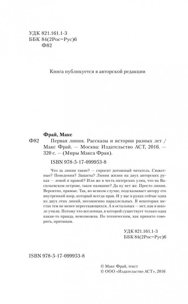 Что за линии такие? – спросит дотошный читатель. Сюжетные? Поведения? Защиты? Линии жизни на двух авторских руках – левой и правой? Или же в честь питерских улиц, что на Васильевском острове, такое название? Да ну нет же. Просто линии. Вероятно, прямые. Так, во всяком случае, подсказывает автору его внутренний взор, который всегда прав. И у вас в руках сейчас одна из двух этих линий, несомненно параллельных. В некоторых местах тем не менее пересекающихся. А в остальных – нет, как в школе учили. Потому что вселенная, в которой существует только одна какая-то правда, невозможна. По техническим, как принято говорить, причинам.