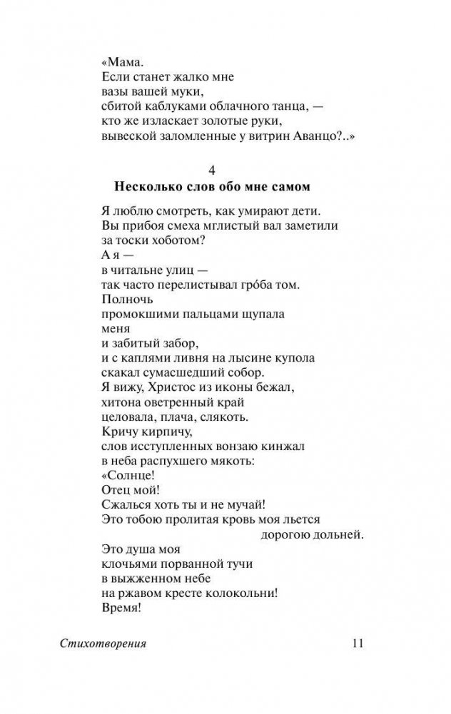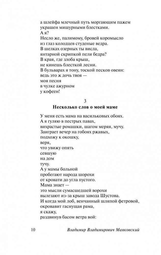 В этот сборник вошли наиболее известные поэмы и стихотворения Маяковского разных лет, в полной мере представляющие читателю уникальный стиль поэта: «Флейта-позвоночник», «Облако в штанах», «Про это», «А вы могли бы?», «Любовь», «Во весь голос», стихи из «американского» цикла и др. Оригинальность, бунтарство, резкость стихотворных строк и невероятная, берущая за душу эмоциональность Маяковского, поражавшие его современников, и сейчас не оставят читателя равнодушным.