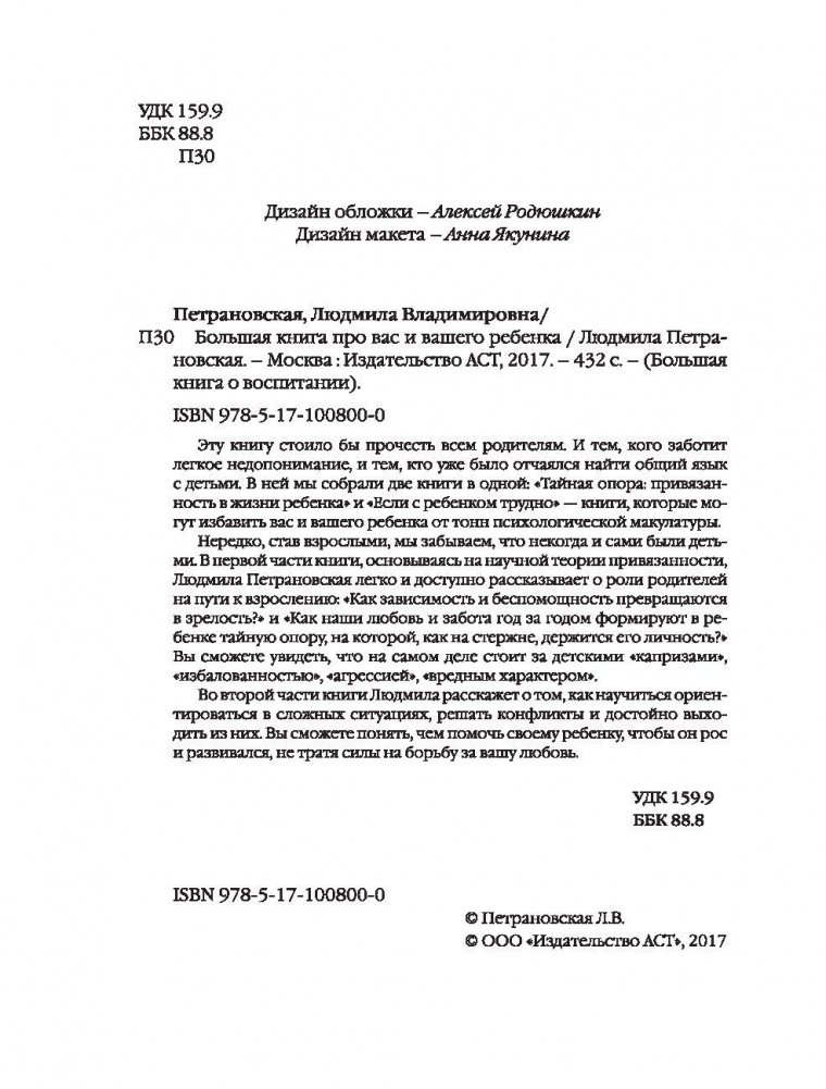 Эту книгу стоило бы прочесть всем родителям. И тем, кого заботит легкое недопонимание, и тем, кто уже было отчаялся найти общий язык с детьми. В ней мы собрали две книги в одной: «Тайная опора: привязанность в жизни ребенка» и «Если с ребенком трудно» - книги, которые могут избавить вас и вашего ребенка от тонн психологической макулатуры. Нередко, став взрослыми, мы забываем, что некогда и сами были детьми. В первой части книги, основываясь на научной теории привязанности, она легко и доступно рассказывает о роли родителей на пути к взрослению: «Как зависимость и беспомощность превращаются в зрелость?» и «Как наши любовь и забота год за годом формируют в ребенке тайную опору, на которой, как на стержне, держится его личность?» Вы сможете увидеть, что на самом деле стоит за детскими «капризами», «избалованностью», «агрессией», «вредным характером». Во второй части книги Людмила расскажет о том, как научиться ориентироваться в сложных ситуациях, решать конфликты и достойно выходить из них. Вы сможете понять, чем помочь своему ребенку, чтобы он рос и развивался, не тратя силы на борьбу за вашу любовь.