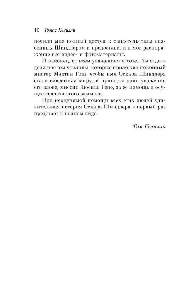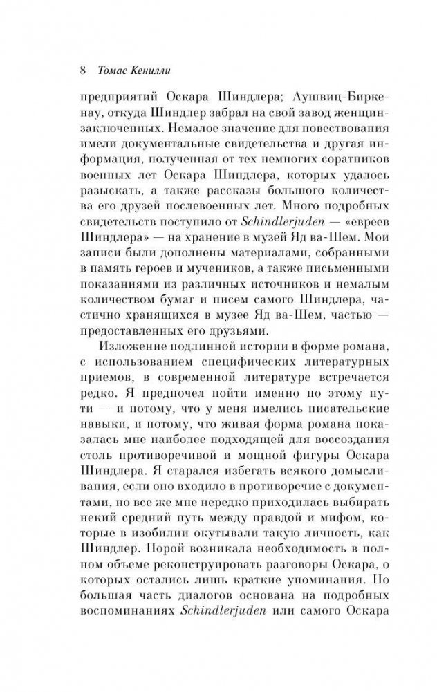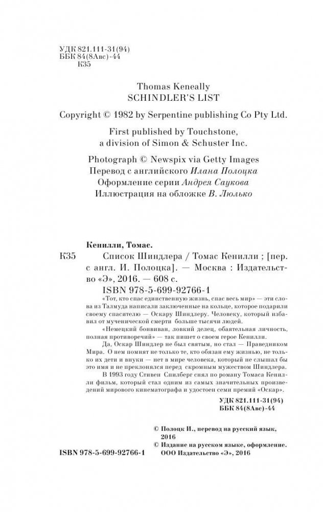 «Тот, кто спас единственную жизнь, спас весь мир» — эти слова из Талмуда написали заключенные на кольце, которое подарили своему спасителю — Оскару Шиндлеру. Человеку, который избавил от мученической смерти больше тысячи людей. «Немецкий бонвиван, ловкий делец, обаятельная личность, полная противоречий» — так пишет о своем герое Кенилли. Да, Оскар Шиндлер не был святым, но стал — Праведником Мира. О нем помнят не только те, кто обязан ему жизнью, не только их дети и внуки — нет в мире человека, который не слышал бы это имя и не преклонялся перед скромным мужеством Шиндлера. В 1993 году Стивен Спилберг снял по роману Томаса Кенилли фильм, который стал одним из самых значительных произведений мирового кинематографа и удостоен семи премий «Оскар».
