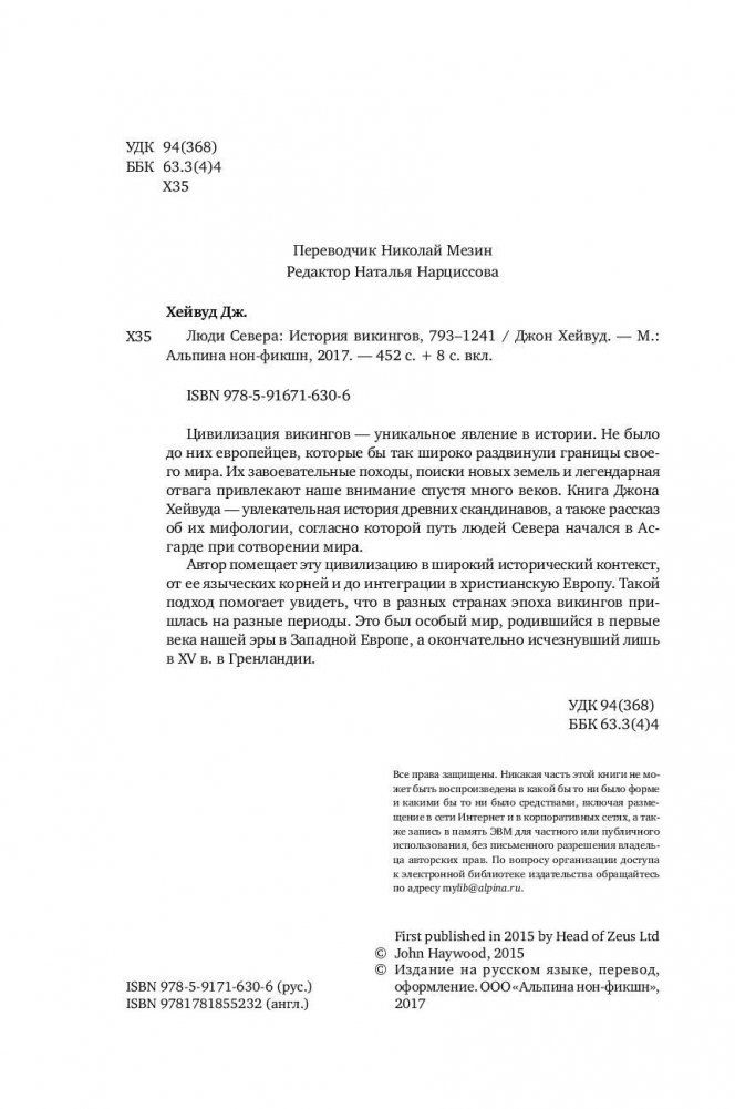 Цивилизация викингов — уникальное явление в истории. Не было до них европейцев, которые бы так широко раздвинули границы своего мира. Их завоевательные походы, поиски новых земель и легендарная отвага привлекают наше внимание спустя много веков. Книга Джона Хейвуда—увлекательная история древних скандинавов, а также рассказ об их мифологии, согласно которой путь людей Севера начался в Ас-гарде при сотворении мира. Автор помещает эту цивилизацию в широкий исторический контекст, от ее языческих корней и до интеграции в христианскую Европу. Такой подход помогает увидеть, что в разных странах эпоха викингов пришлась на разные периоды. Это был особый мир, родившийся в первые века нашей эры в Западной Европе, а окончательно исчезнувший лишь в XV веке в Гренландии.