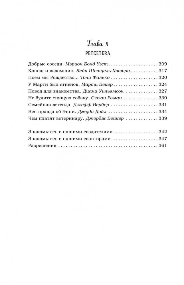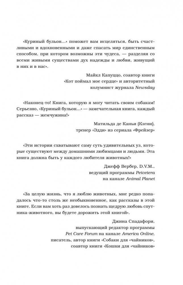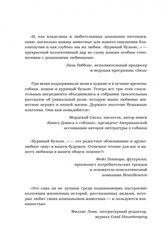 В этот сборник вошли самые разнообразные - трогательные, забавные, смешные, наивные, серьёзные истории о животных. Эти истории ненавязчивы и правдивы, они говорят о связи между животными и людьми. Домашние питомцы вносят в нашу жизнь не только заботы и ответственность, но сильную связь, любовь, радость общения, взаимопонимания. Общение с животными – лекарство для души, как куриный суп – для желудка. Эти истории будут согревающим, исцеляющим и укрепляющим лекарством для души и увлекательным чтением для вас.
