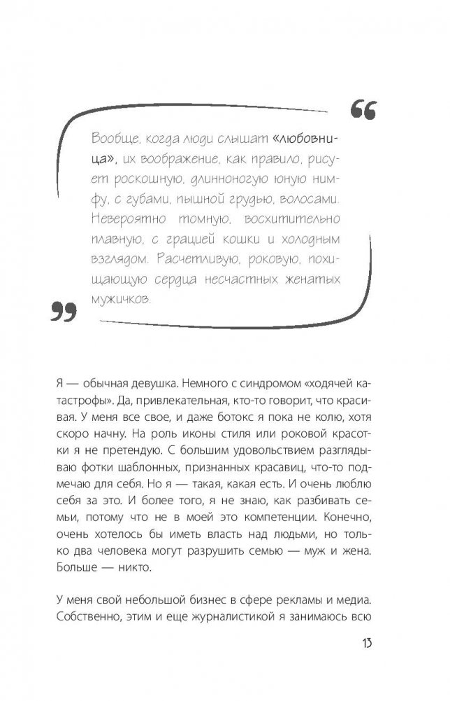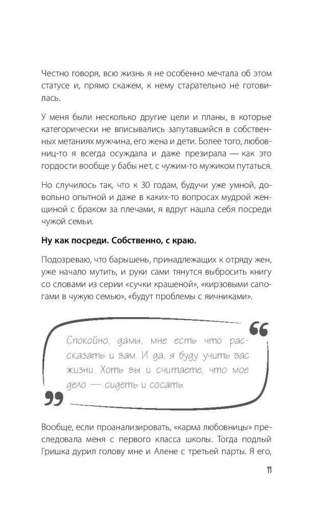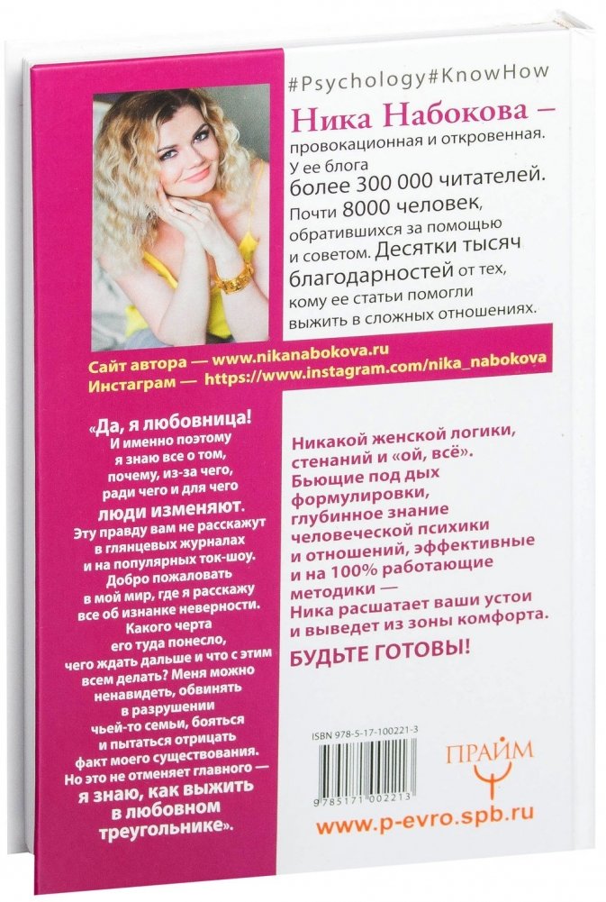 Ника Набокова – провокационная и откровенная, красивая молодая женщина с мозгами, которым может позавидовать любой успешный мужчина. В ее блоге более 300 тысяч читателей. Почти 8000 человек, обратившихся за помощью и советом. Десятки тысяч благодарностей от тех, кому ее статьи помогли выжить в сложных отношениях. «Да, я любовница! И именно поэтому я знаю все о том, почему, из-за чего, ради чего и для чего люди изменяют. Эту правду вам не расскажут в глянцевых журналах и на популярных ток-шоу. Добро пожаловать в мой мир, где я расскажу все об изнанке неверности. Какого черта его туда понесло, чего ждать дальше и что с этим всем делать? Меня можно ненавидеть, обвинять в разрушении чьей-то семьи, бояться и пытаться отрицать факт моего существования. Но это не отменяет главного – я знаю, как выжить в любовном треугольнике». Никакой женской логики, стенаний и «ой, все». Бьющие под дых формулировки, глубинное знание человеческой психики и отношений, эффективные и на 100% работающие методики – Ника расшатает ваши устои и выведет из зоны комфорта. Будьте готовы!