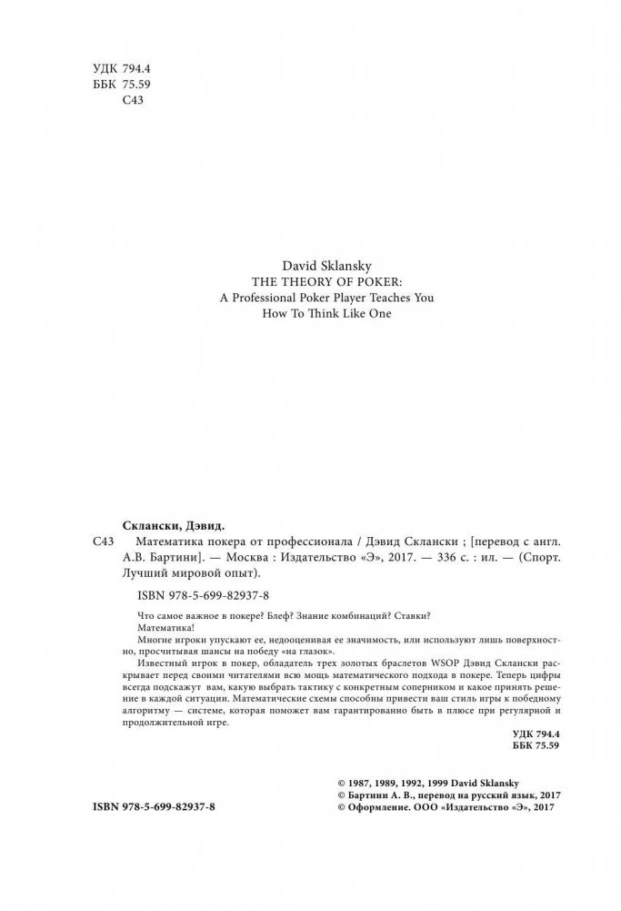 Что самое важное в покере? Блеф? Знание комбинаций? Ставки? Математика! Многие игроки упускают ее, недооценивая ее значимость или используют лишь поверхностно, просчитывая шансы на победу "на глазок". Известный игрок в покер, обладатель трех золотых браслетов WSOP - Дэвид Склански, раскрывает перед своим читателями всю мощь математического подхода в покере. Теперь цифры всегда подскажут вам какую выбрать тактику с конкретным соперником и какое принять решение в каждой ситуации. Математические схемы способны привести ваш стиль игры к победному алгоритму - системе, которая поможет вам гарантированно быть в плюсе при регулярной и продолжительной игре.