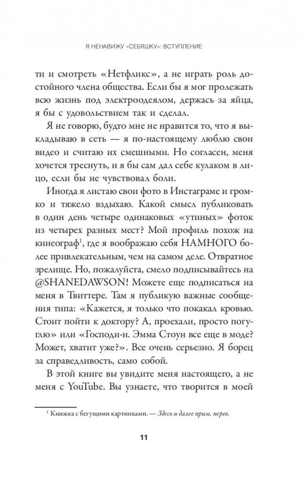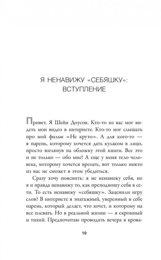 Шейн Доусон – американский видеоблогер, актер и комик. Его канал на YouTube насчитывает более 7,7 млн подписчиков. Шейн прославился своими яркими пародиями на знаменитостей. Он начал снимать влоги в 2008 году, а уже в 2014-ом выпустил первый полнометражный фильм Not Cool, в котором выступил режиссером и исполнителем главной роли. В 2010 году Шейн попал в список «25 популярных звезд Интернета» по версии Forbes. В сборнике «Я ненавижу селфи» Шейн делится историями эксцентричного подростка, который смог завоевать огромную толпу фанатов благодаря своему уникальному взгляду на жизнь. Эта книга о том, какими трудными и неловкими могут быть подростковые годы и как легко становится на душе, когда (практически) все далеко позади.