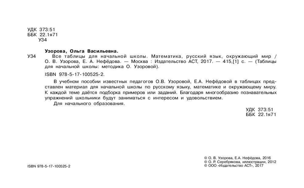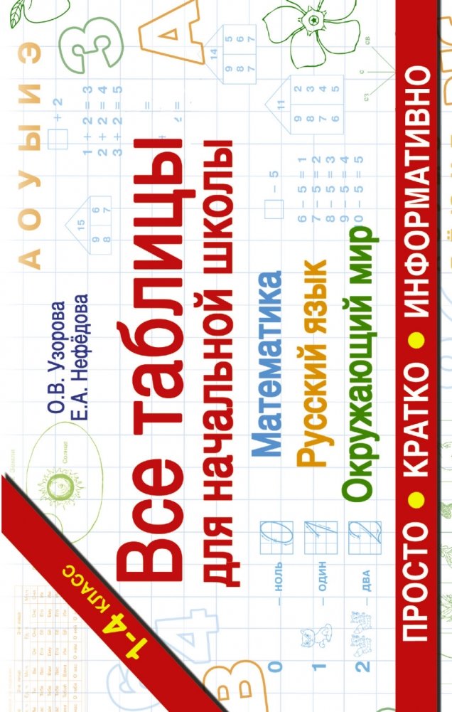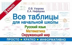 В учебном пособии известных педагогов О.В. Узоровой, Е.А. Нефёдовой «Все таблицы для начальной школы. Русский язык. Математика. Окружающий мир» в таблицах представлен материал для начальной школы по русскому языку, математике и окружающему миру. К каждой теме даётся подборка примеров или заданий. Благодаря многообразию познавательных упражнений школьники будут заниматься с интересом и удовольствием. Для начального образования.