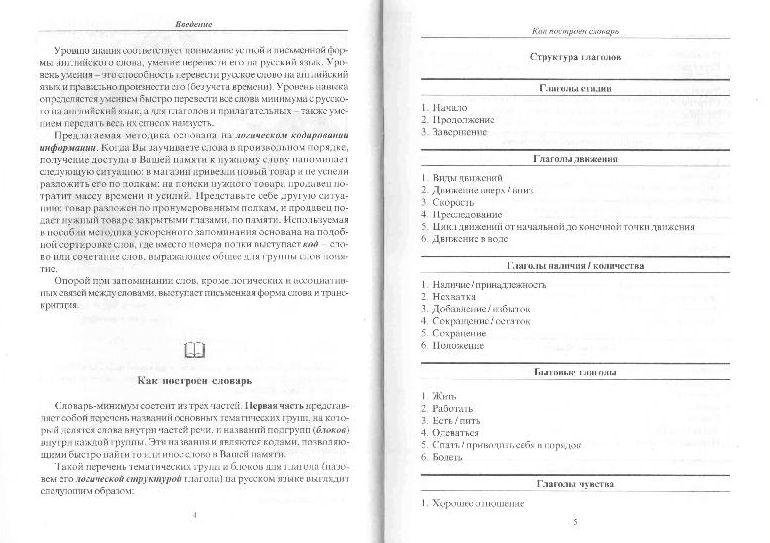 Пособие представляет собой словарь-минимум, содержащий более 3300 слов, необходимых для общения на английском языке. Словарь создан по оригинальной методике ускоренного запоминания английских слов. В основе методики лежит логическое кодирование - деление слов внутри частей речи на группы, объединенные общим понятием или ассоциацией, и присвоение им названий-кодов. Это позволяет легко вспомнить нужное слово, быстро "прокрутив" в памяти весь словарь. Словарь-минимум рассчитан на широкий круг лиц, изучающих английский язык самостоятельно и стремящихся углубить и систематизировать свои знания.