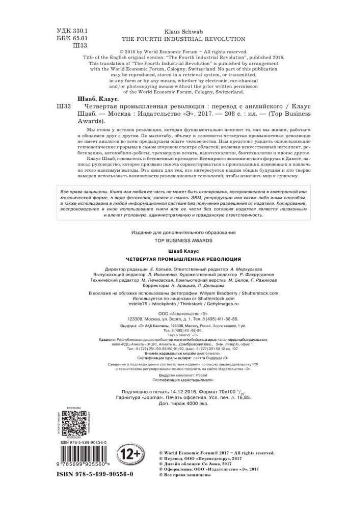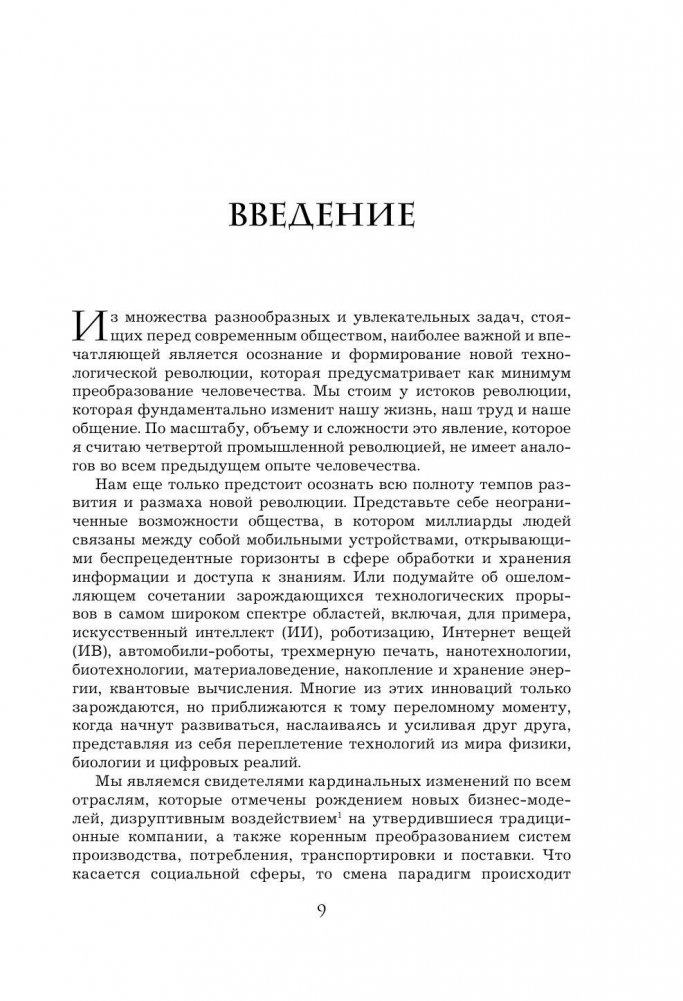 Мы стоим у истоков революции, которая фундаментально изменит то, как мы живем, работаем и общаемся друг с другом. По масштабу, объему и сложности четвертая промышленная революция не имеет аналогов во всем предыдущем опыте человечества. Нам предстоит увидеть ошеломляющие технологические прорывы в самом широком спектре областей, включая, искусственный интеллект, роботизацию, автомобили-роботы, трехмерную печать, нанотехнологии, биотехнологии и многое другое. Клаус Шваб, основатель и бессменный президент Всемирного экономического форума в Давосе, написал руководство, которое призвано помочь сориентироваться в происходящих изменениях и извлечь из этого максимум выгоды. Эта книга для тех, кто интересуется нашим общим будущим и кто твердо намерен использовать возможности революционных изменений, чтобы изменить мир к лучшему.