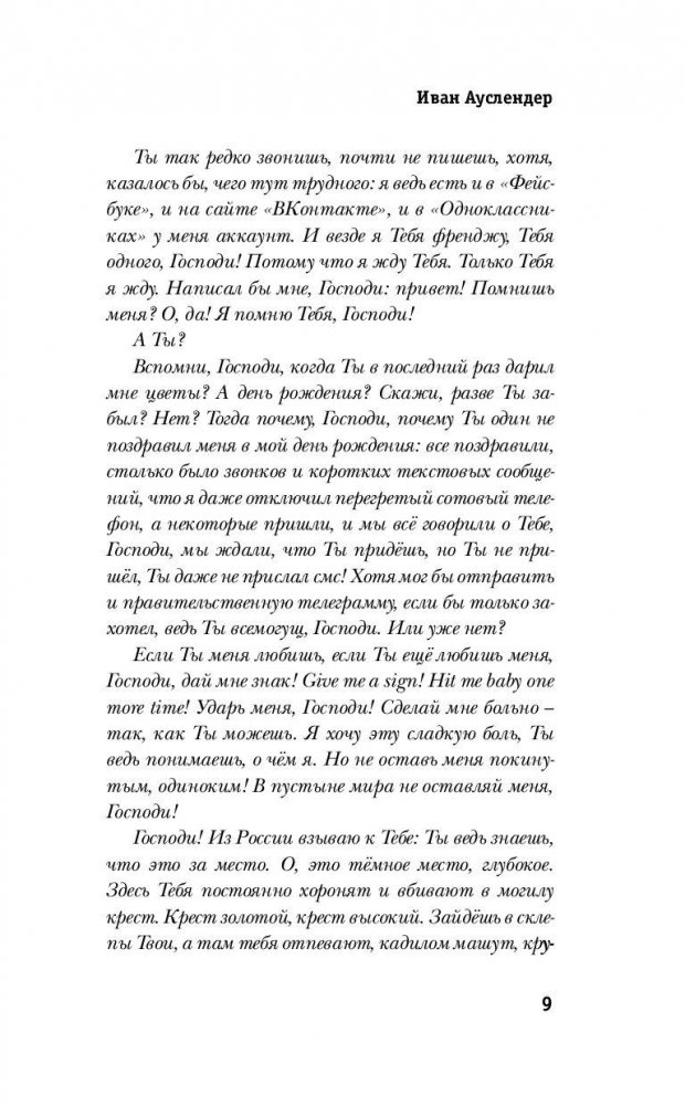 «Иван Ауслендер», новый роман Германа Садулаева, талантливого постмодерниста, финалиста премий «Русский Букер», «Национальный бестселлер», «Большая книга», – это полный сарказма и неожиданного тонкого лиризма интеллектуальный палп-фикшн о 2010-х годах, русской интеллигенции и поиске себя. Средних лет университетский преподаватель поневоле оказывается втянутым в политику: митинги, белые ленты, «честные» выборы… На смену мнимому чувству свободы вскоре приходит разочарование, и он, подобно известным литературным героям, пускается в путешествие по России и Европе, которое может стать последним…