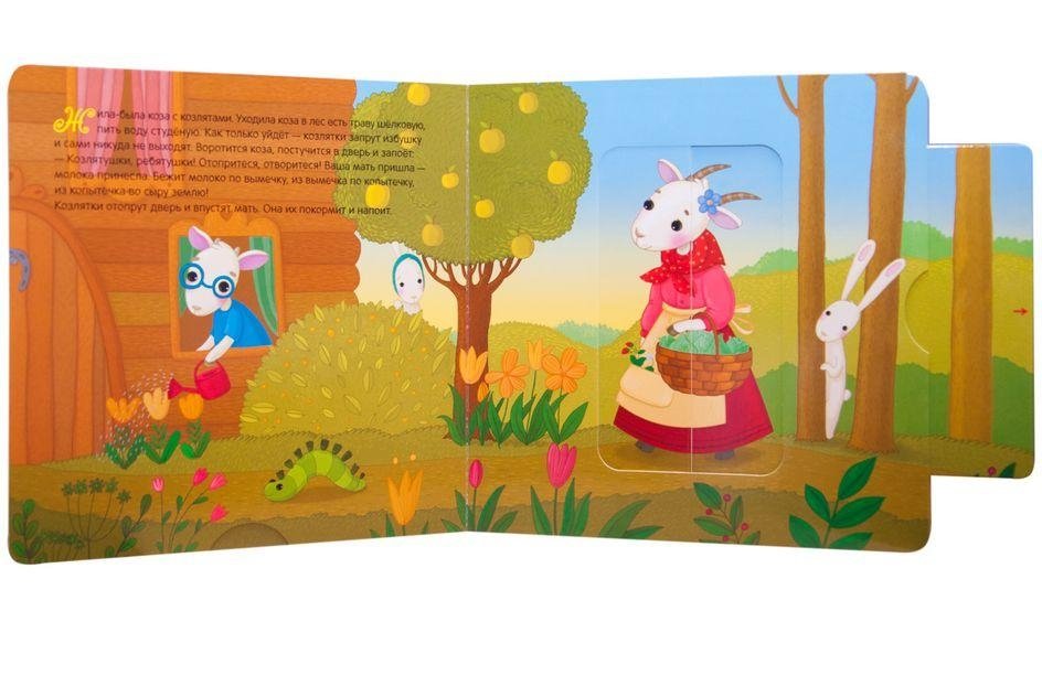 Любимая русская народная сказка о Волке и козлятах оживает на страницах интерактивной книги с колесиком, движущимися элементами, окошками и клапанами. Внутри маленького читателя ждет множество сюрпризов! Потянув за клапаны и приведя в движение подвижные элементы, малыш сможет помочь козлятам спрятаться от Серого Волка и многое другое. Книга «Волк и козлята» серии «Интерактивные сказки» не оставит равнодушными Вас и Вашего ребенка, ведь ее можно не только читать, с ней можно играть как с игрушкой. Это способствует развитию речи, мелкой моторики и воображения, а также пробуждению интереса к чтению.