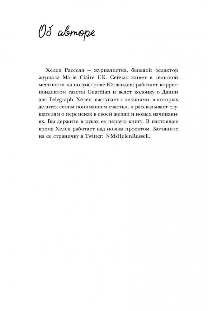 Променять Лондон и работу в Marie Claire на датский городок с населением 6000 человек?! Сначала она твердо сказала «НЕТ». Но потом… муж так мечтал поработать в LEGO. И еще было безумно интересно, как в стране с такой скверной погодой и запредельными налогами живут самые счастливые люди на планете? Согласившись на авантюру с переездом в Данию, Хелен Расселл твердо решила применить свой талант и опыт журналиста и в течение года обязательно выяснить: как правильно заниматься хюгге (что бы это слово ни означало); как есть булочки не поправляясь (и не расплачиваться за другие удовольствия тоже); как стать по-датски счастливым (даже если вы родились на другом конце света).
