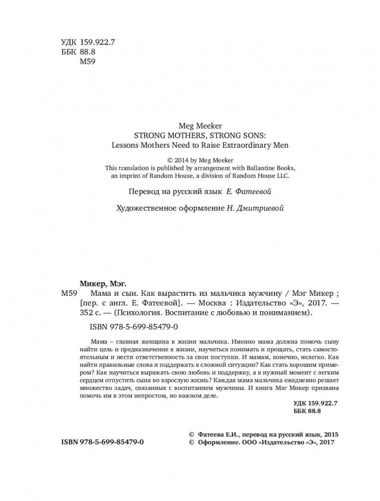 Мама – главная женщина в жизни мальчика. Именно мама должна помочь сыну найти цель и предназначение в жизни, научиться понимать и прощать, стать самостоятельным и нести ответственность за свои поступки. И мамам, конечно, нелегко. Как найти правильные слова и поддержать в сложной ситуации? Как стать хорошим примером? Как научиться выражать свою любовь и поддержку, а в нужный момент с легким сердцем отпустить сына во взрослую жизнь? Каждая мама мальчика ежедневно решает множество задач, связанных с воспитанием мужчины. И книга Мэг Микер призвана помочь им в этом непростом, но важном деле.