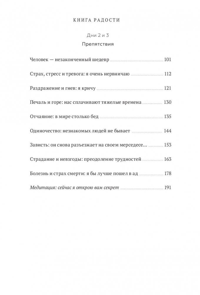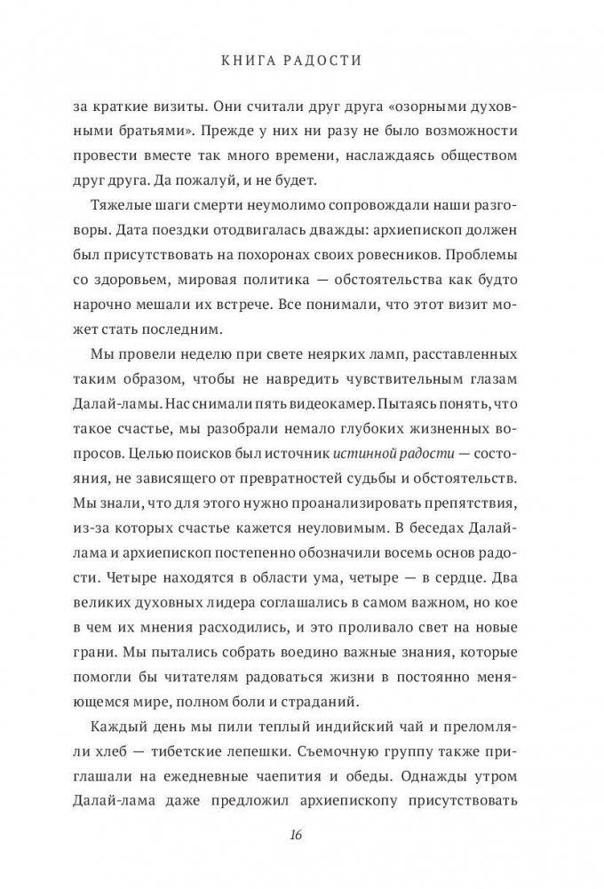 Два великих духовных лидера. Пять дней. Один вечный вопрос. В апреле 2015 года два самых радостных человека на свете — лауреаты Нобелевской премии Далай-лама и архиепископ Туту — встретились в Дхарамсале, чтобы отметить восьмидесятый день рождения Его Святейшества, оглянуться на прожитые годы, полные непростых испытаний, и найти ответ на вечный вопрос: как найти радость в жизни, когда нас обуревают повседневные невзгоды — от недовольства дорожными пробками до страха, что мы не сможем обеспечить семью, от злости на тех, кто несправедливо с нами обошелся, до горя утраты любимого человека, от опустошенности, которую приносит тяжелая болезнь, до бездны отчаяния, приходящей со смертью? Диалоги велись в течение недели. Духовные мастера обсуждали препятствия, которые мешают нам радоваться жизни, подробно проговаривали негативные эмоции, их воздействие на человека и главное — ответ на вопрос «что делать?». Как справиться с гневом, яростью, горем утраты, отчаянием, разочарованием, завистью? Отвечая на вопросы, Далай-лама и архиепископ приводят примеры из своей жизни, общаясь с читателем на равных, все время подчеркивая, что каждому человеку, будь он духовным лидером или одним из современных людей, живущих в суете материалистического мира, свойственны одни и те же эмоциональные реакции. Все мы испытываем зависть, злимся и теряем близких, разница в том, как мы реагируем. Мужество Далай-ламы и архиепископа, их стойкость и неунывающая вера в человечность вдохновляют миллионы людей. Они не поддаются модному цинизму, волна которого захлестывает нас сегодня. Их умение радоваться жизни не поверхностно и далось им непросто; оно закалено в огне конфликтов, противостояния и борьбы. Их судьба: неустанное напоминание о том, что радость жизни — право, данное нам от рождения. Радость — понятие намного более глубокое, чем счастье. В конце книги приведен перечень практик — простых упражнений, которые помогут выровнять психологическое состояние и сохранить внутренний стержень во времена стрессов и тревог.