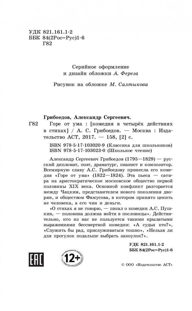 Александр Сергеевич Грибоедов (1795 – 1829) – русский дипломат, поэт, драматург, пианист и композитор. Всемирную славу А.С. Грибоедову принесла его комедия «Горе от ума» (1822–1824). Эта пьеса – сатира на аристократическое московское общество первой половины ХIХ века. Основной конфликт разгорается между Чацким, представителем нового поколения дворян, и обществом Фамусова, в котором принято ценить не человека, а его чин и деньги. «О стихах я не говорю, – писал о комедии А.С. Пушкин, – половина должна войти в пословицы». Действительно, кто из нас не пользуется такими крылатыми выражениями бессмертной комедии: «А судьи кто?», «Служить бы рад, прислуживаться тошно», «Нельзя ли для прогулок подальше выбрать закоулок?»
