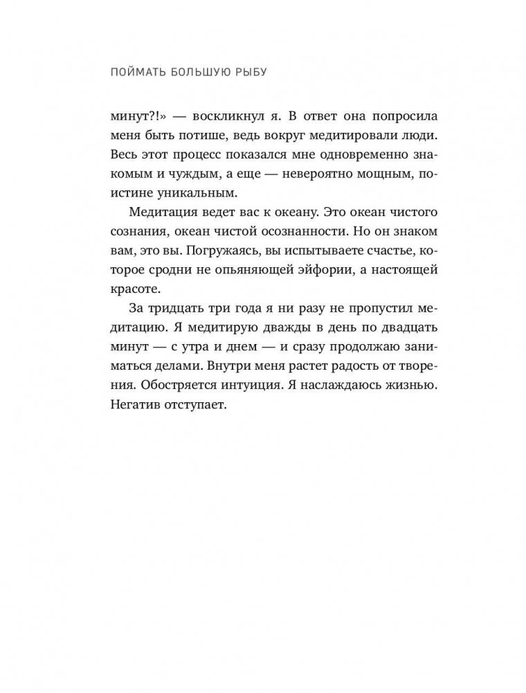 Текст этой книги обладает магическим свойством: он создает иллюзию присутствия в голове великого режиссера. Вместе с Дэвидом Линчем мы погружаемся в пучину творческого поиска, постигаем принципы трансцендентальной медитации, учимся управлять внутренней энергией и пытаемся поймать свою большую рыбу. Эта книга, ставшая бестселлером на Западе, – уникальный источник вдохновения для всех, кто желает развивать творческие способности. Она позволяет увидеть то, что раньше оставалось невидимым, услышать то, что всегда находилось за гранью слышимого, открыть дверь, о существовании которой вы даже не подозревали.