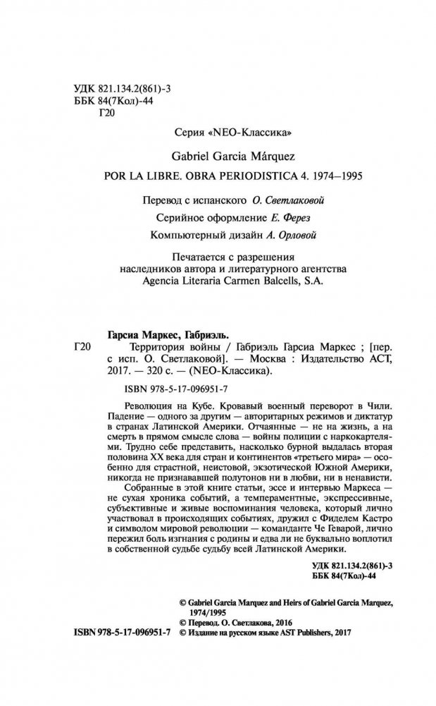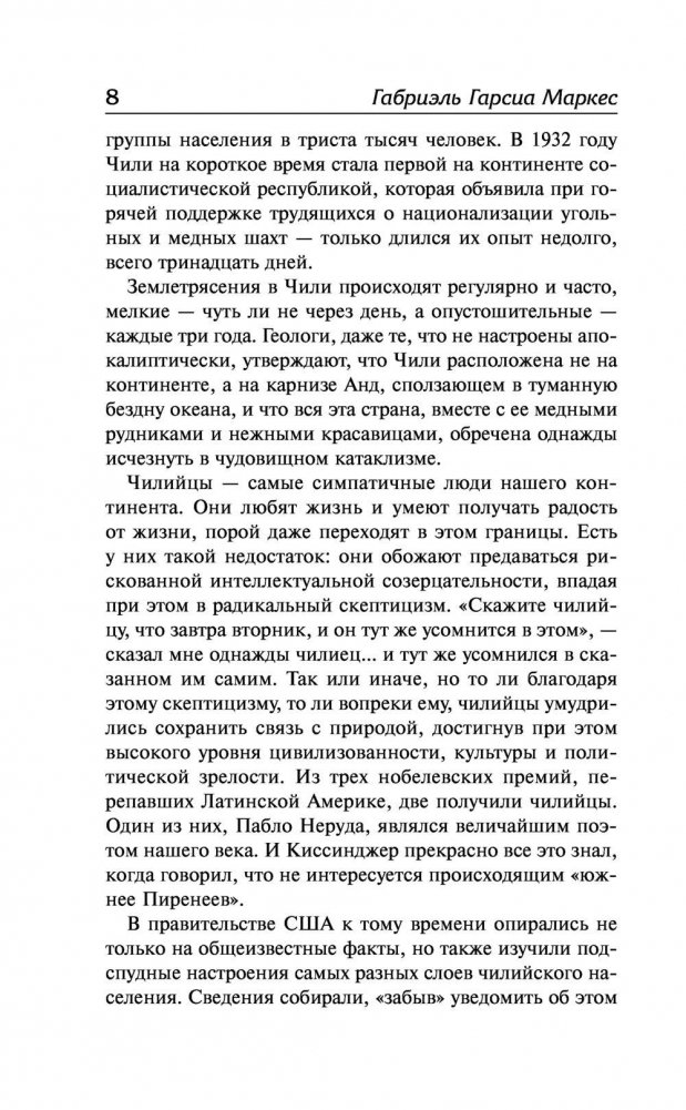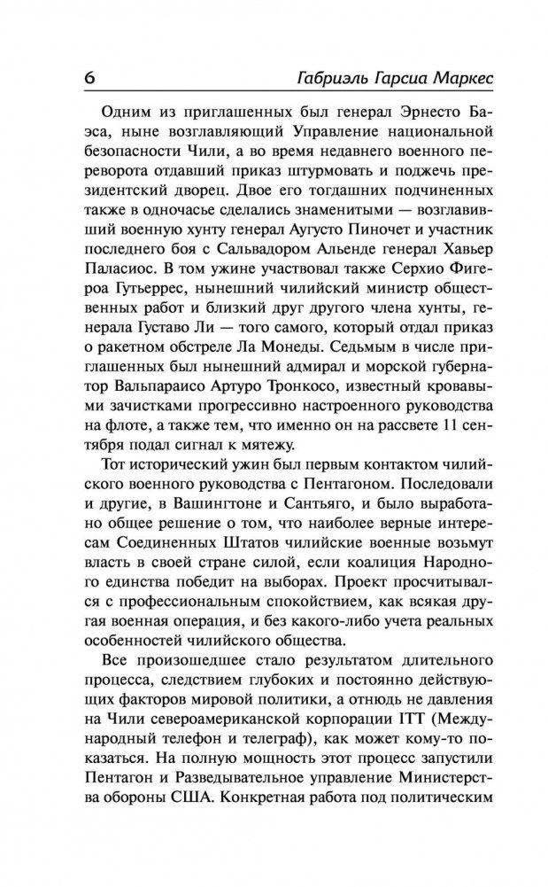Революция на Кубе. Кровавый военный переворот в Чили. Падение – одного за другим – авторитарных режимов и диктатур в странах Латинской Америки. Отчаянные – не на жизнь, а на смерть в прямом смысле слова – войны полиции с наркокартелями. Трудно себе представить, насколько бурной выдалась вторая половина XX века для стран и континентов «третьего мира» – особенно для страстной, неистовой, экзотической Южной Америки, никогда не признававшей полутонов ни в любви, ни в ненависти. Собранные в этой книге статьи, эссе и интервью Маркеса – не сухая хроника событий, а темпераментные, экспрессивные, субъективные и живые воспоминания человека, который лично участвовал в происходящих событиях, дружил с Фиделем Кастро и символом мировой революции – команданте Че Геварой, лично пережил боль изгнания с родины и едва ли не буквально воплотил в собственной судьбе судьбу всей Латинской Америки.