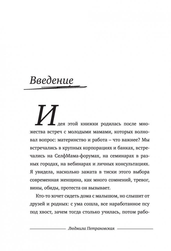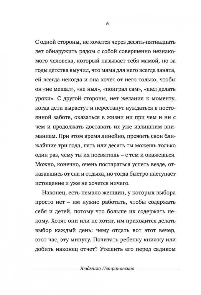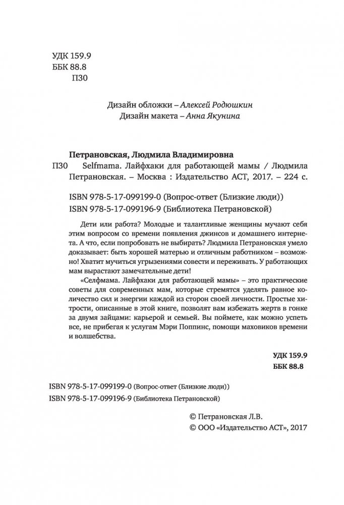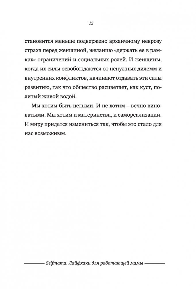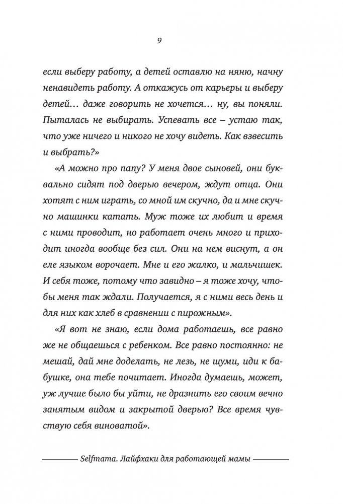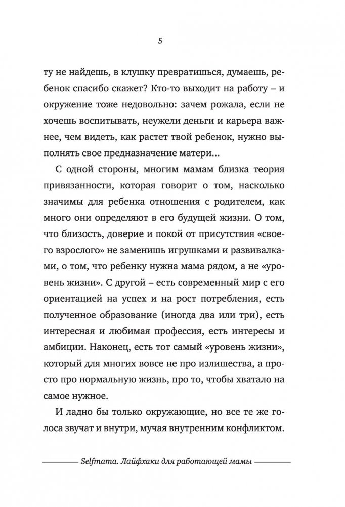 Дети или работа? Молодые и талантливые женщины мучают себя этим вопросом со времени появления джинсов и домашнего интернета. А что, если попробовать не выбирать? Людмила Петрановская умело доказывает: быть хорошей матерью и отличным работником – возможно! Хватит мучиться угрызениями совести и переживать. У работающих мам вырастают замечательные дети! «Селфмама. Лайфхаки для работающей мамы» – это практические советы для современных мам, которые стремятся уделять равное количество сил и энергии каждой из сторон своей личности. Простые хитрости, описанные в этой книге, позволят вам избежать жертв в гонке за двумя зайцами: карьерой и семьей. Вы поймете, как можно успеть все, не прибегая к услугам Мэри Поппинс, помощи маховиков времени и волшебства.