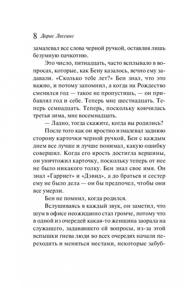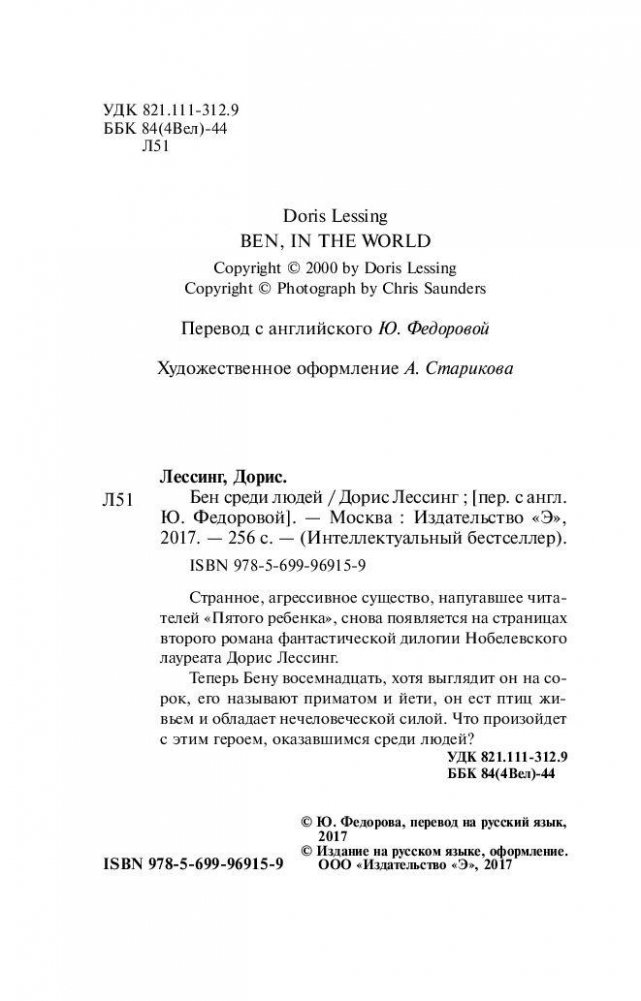 Странное, агрессивное существо, напугавшее читателей "Пятого ребенка", снова появляется на страницах второго романа фантастической дилогии Нобелевского лауреата Дорис Лессинг. Теперь Бену восемнадцать, хотя выглядит он на сорок, его называют приматом и йети, он ест птиц живьем и обладает нечеловеческой силой. Что произойдет с этим героем, оказавшимся среди людей?