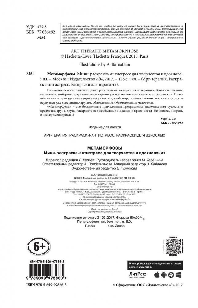 Расслабьтесь после тяжелого дня с раскрасками из серии "Арт-терапия". Возьмите цветные карандаши, выберите понравившуюся картинку и полностью отключитесь от реальности. Плавные линии и причудливые узоры унесут вас в другой мир, позволят полностью снять стресс и вернуться уже совершенно другим, обновленным и безмятежным, человеком. "Метаморфозы" – это бесконечные причудливые превращения знакомых нам существ и предметов друг в друга. Раскрасьте эти необычные создания в яркие цвета. Не бойтесь творить и экспериментировать!