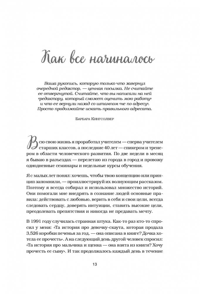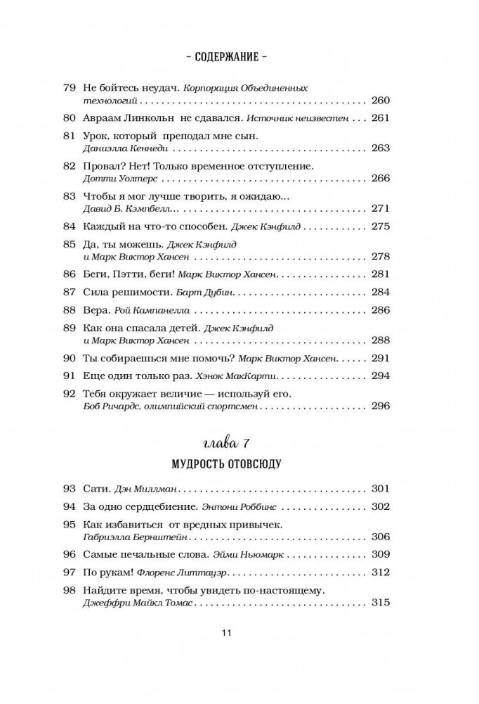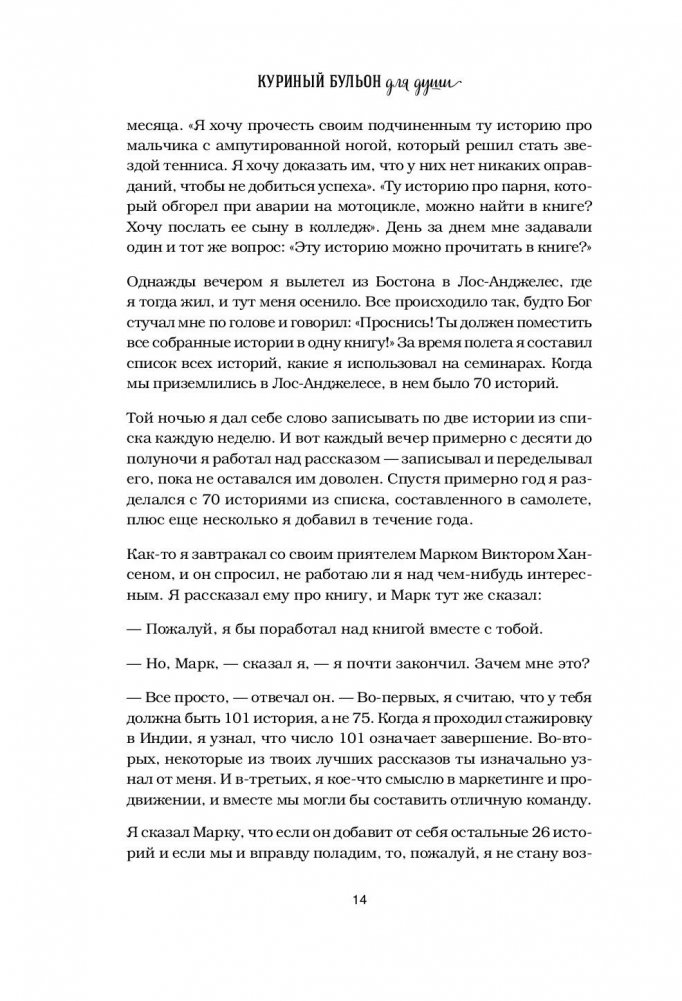 В детстве, когда вы болели, ваша бабушка давала вам куриный бульон. Сегодня питание и забота нужны вашей душе. Маленькие истории из "Куриного бульона" - исцелят душевные раны и укрепят дух, дадут вашим мечтам новые крылья и откроют секрет самого большого счастья - счастья делиться и любить. Маленький мальчик из простой семьи знакомится с тремя президентами. Мать-одиночка заводит Книгу Желаний - и все ее мечты исполняются. Неудавшаяся актриса обретает истинное счастье, узнав что у нее…. рак. Самая красивая девушка города влюбляется в горбуна после двух фраз. Учительница устраивает похороны вместо урока. 13-летняя девочка продает 45 526 коробки печенья, чтобы осуществить мамину мечту. И другие 95 поразительных историй, от которых вы не сможете оторваться.