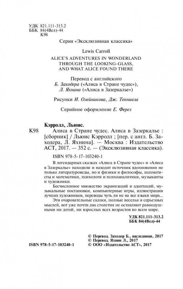 В легендарных сказках «Алиса в Стране чудес» и «Алиса в Зазеркалье» находили и находят источник вдохновения не только литературоведы, но и физики и философы, шахматисты и математики, психологи и психоаналитики, музыканты и художники. Бесчисленное множество экранизаций и адаптаций, музыкальные постановки, компьютерные игры, иллюстрации лучших художников, переводы чуть ли не на все языки мира… Эти очаровательные сказки, полные веселья и серьезных мыслей, вот уже почти два столетия не оставляют равнодушными ни детей, ни взрослых всех возрастов во всем мире.