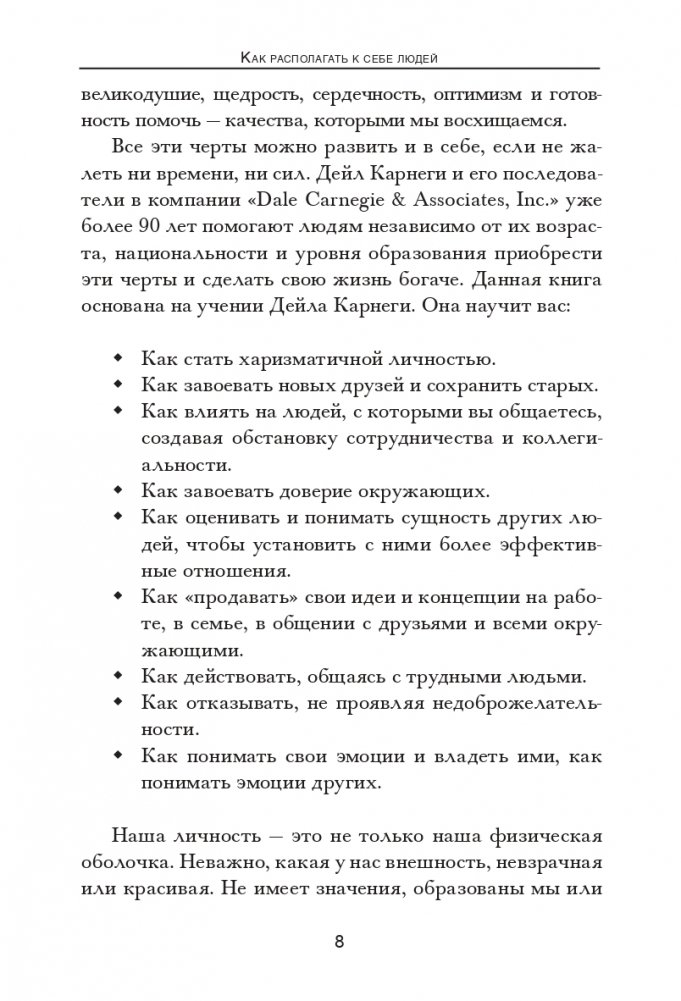 Есть люди, притягивающие к себе как будто магнитом. Им не надо никого ни о чем просить — все сами с удовольствием предлагают им помощь. Они способны склонить кого угодно к своей точке зрения, не промолвив ни слова. Они пользуются огромной популярностью, их карьера взлетает с головокружительной скоростью, а жизнь напоминает сплошной праздник. Хотите стать такими же? Это возможно! Новая книга Дейла Карнеги научит вас располагать к себе людей, завоевывать новых друзей и сохранять старых, влиять на чужое мнение, вызывать у окружающих доверие и устанавливать эффективные отношения даже с самыми конфликтными людьми.