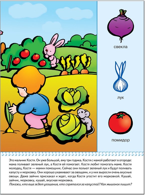 Мир, в котором мы живем, очень большой и сложный. Но знакомство с ним пройдет легко и интересно, если границы мира малыша расширять постепенно. Ребенок уже хорошо знает свой дом. Теперь можно совершить путешествие по огороду и даче, а потом по саду, ферме, активно обогащая словарный запас малыша. Книжка помогает развить коммуникативные способности ребенка: ведь и с зайчиком, и с мышонком нужно пообщаться, угостить их чем-нибудь вкусным. Для детей 1–2 лет.