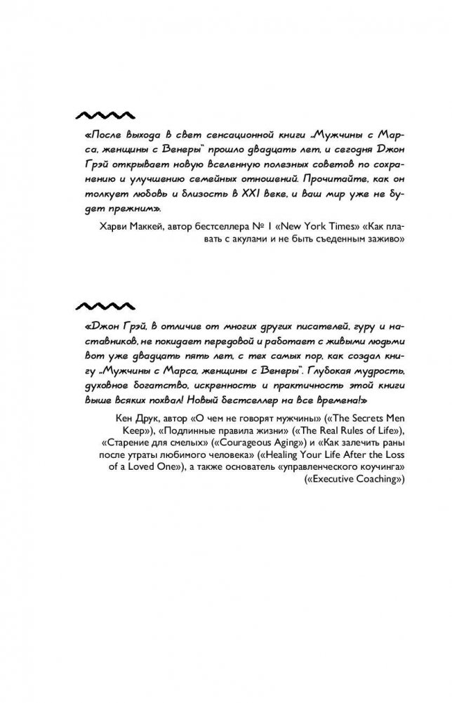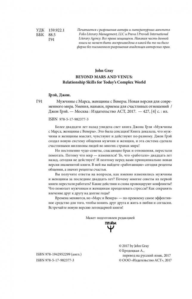 Более двадцати лет назад увидела свет книга Джона Грэя «Мужчины с Марса, женщины с Венеры». Это была сенсация! Книга доказала, что мужчины и женщины мыслят, чувствуют и действуют по-разному. Джон Грэй создал новую систему общения мужчин и женщин, и эта система сделала счастливыми миллионы людей во многих странах мира! Но постепенно чудо-советы, спасающие брак и отношения, перестали помогать. Потому что мир — изменился! То, что «работало» двадцать лет назад, сегодня не действует! И поэтому перед вами принципиально новая версия знаменитой книги. В ней вы найдете «работающие» сегодня рецепты общения, а значит рецепты счастья. Вы получите ответы на вопросы, как именно изменились мужчины и женщины за последние двадцать лет? Почему многие советы из первой книги перестали работать? Какие действия и слова провоцируют конфликты? Что помогает мужчинам и женщинам преодолевать стрессы? Как сохранять влечение друг к другу на долгие годы? Времена меняются, но «Марс и Венера» по-прежнему самое эффективное средство для того, чтобы понять друг друга и жить в любви и согласии. Встречайте новую версию легендарной книги!