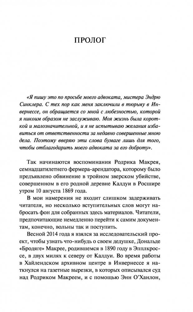 Шотландия, 1869 год. Жуткое тройное убийство, происшедшее в отдаленной сельской общине в Хайленде, закончилось арестом 17-летнего юноши по имени Родрик Макрей. Из его личных дневников абсолютно ясно, что он виновен в этом преступлении. Но они же привлекли к себе внимание лучших юристов и психиатров страны, стремящихся выяснить, что именно заставило Макрея совершить этот чудовищный акт насилия. Безумен ли он? Впрочем, для суда дело уже фактически решено. И один лишь адвокат, изо всех сил старающийся спасти своего подопечного, стоит сейчас между Родриком и виселицей…