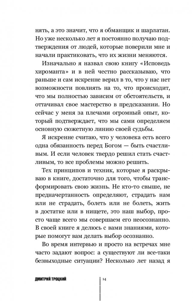 Дмитрий Троцкий — хиромант, который больше не предсказывает судьбу, так как уверен, что ее можно изменить. "За последние 20 лет я просмотрел более 30 000 пар рук, все время изучая взаимосвязи между тем, что мы чувствуем, думаем, говорим, делаем, и событиями в нашей жизни. Сейчас я могу с уверенностью сказать: все, что с нами происходит — мы это заслужили исполнением или неисполнением своей роли. В этой книге я даю инструкцию, как разобраться, — кто я, какая у меня роль в каждой конкретной ситуации, и что это вообще такое — роль. Я рассказываю, на что нужно опираться при выборе профессии, своей второй половинки, как раскрыть свой творческий потенциал и найти свое предназначение, как исцелиться от той или иной болезни и достичь благосостояния. В книге нет абстрактных рассуждений, только руководство к действию и ответ на главный вопрос: что мне делать — прямо сейчас и в жизни в целом".