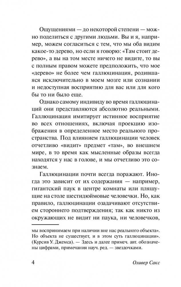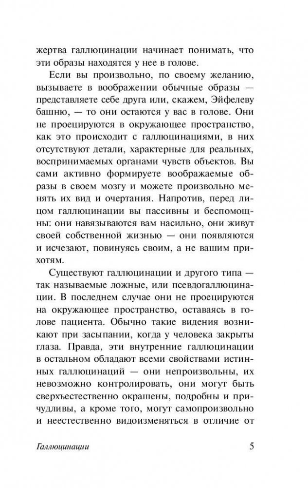 В Средние века их объясняли духовным просветлением или, напротив, одержимостью дьяволом. Десятки людей были объявлены святыми, тысячи сгорели на кострах инквизиции. В наше время их принято считать признаком сумасшествия, тяжелой болезни или следствием приема наркотических средств. Но так ли это? Вы крепко спите в своей комнате и внезапно просыпаетесь от резкого звонка в дверь. Вскочив, вы подходите к двери, но там никого нет. "Наверное, показалось", — думаете вы, не догадываясь, что это была типичная галлюцинация. "Какая галлюцинация? Ведь я же не сумасшедший!" В своей новой работе Оливер Сакс обращается к миру галлюцинаций, и, как всегда, главную ценность книги представляют реальные истории людей, вступивших в упорную борьбу за возвращение к психическому здоровью и полноценной жизни!