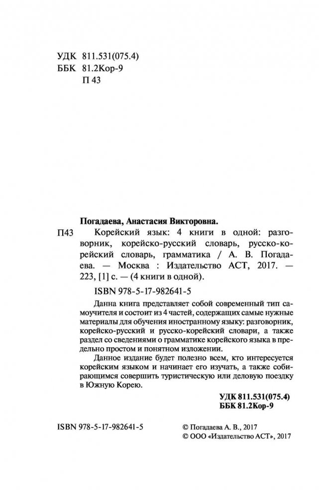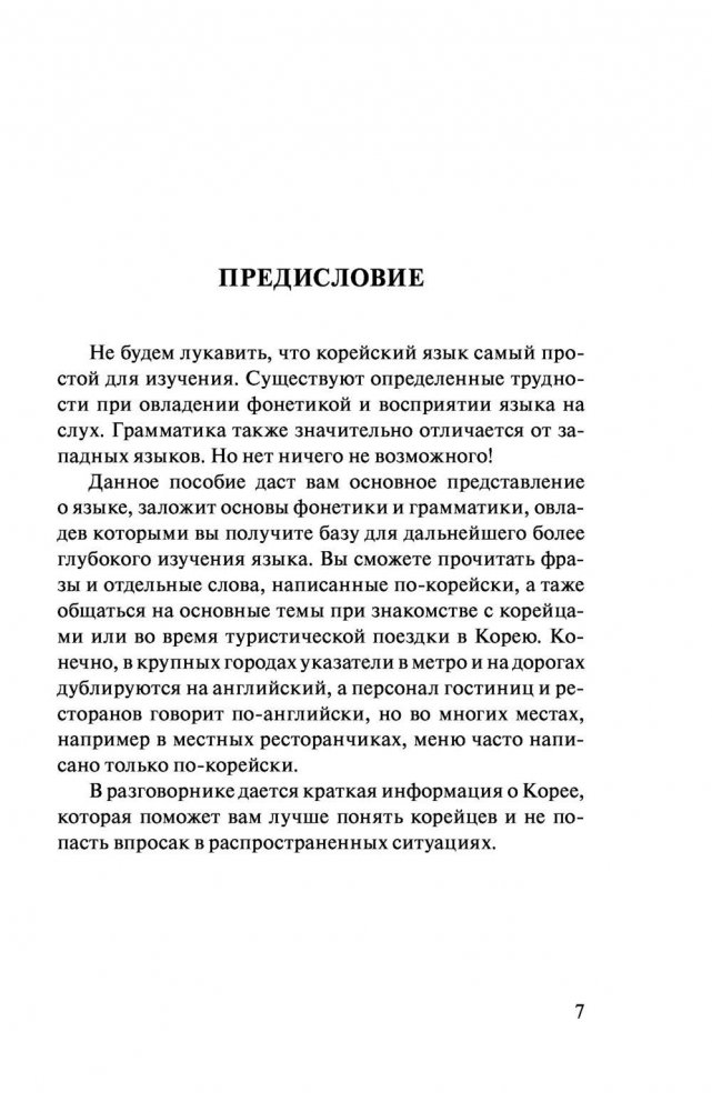 Данная книга представляет собой современный тип самоучителя и состоит из 4 частей, содержащих самые нужные материалы для обучения иностранному языку: разговорник, корейско-русский и русско-корейский словари, а также раздел со сведениями о грамматике корейского языка в предельно простом и понятном изложении. Данное издание будет полезно всем, кто интересуется корейским языком и начинает его изучать, а также собирающимся совершить туристическую или деловую поездку в Южную Корею.