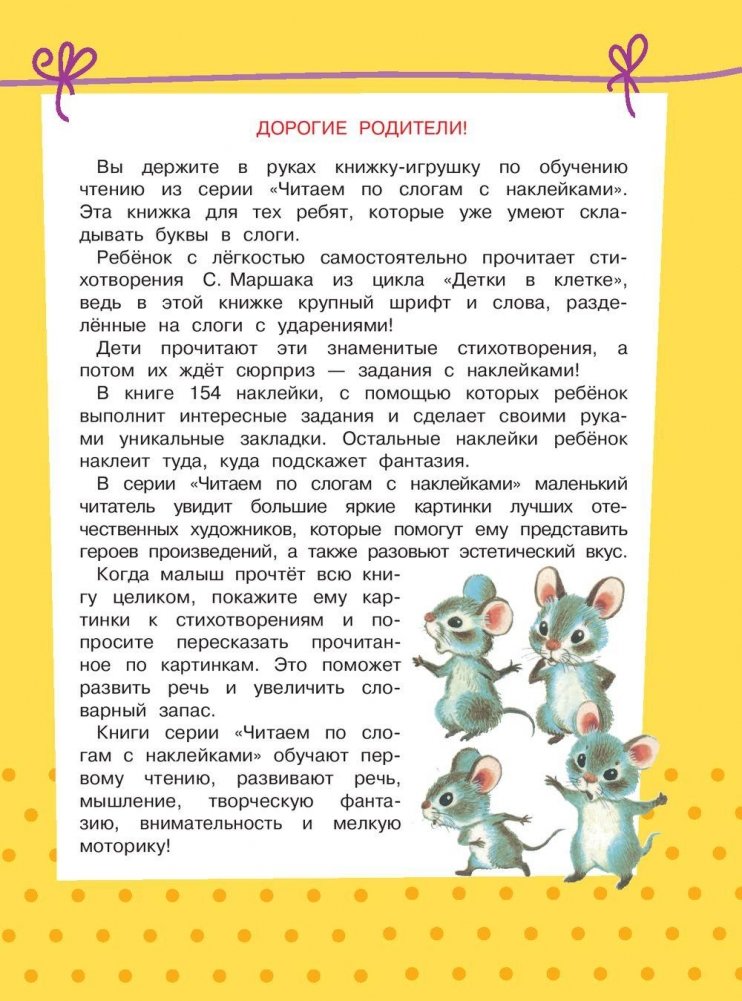 Как привить ребенку любовь к чтению? Это легко сделать с помощью книжки С. Маршака "Детки в клетке" из серии "Читаем по слогам с наклейками". Ведь здесь крупный шрифт, большие картинки и все слова разбит на слоги с ударениями. А в конце мальчиков и девочек ждет сюрприз - интересные задания с наклейками! Эти книги развивают речь, мышление и мелкую моторику.