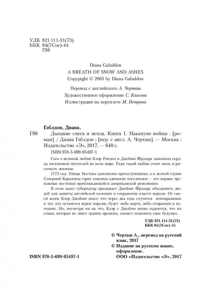 Сага о великой любви Клэр Рэндол и Джейми Фрэзера завоевала сердца миллионов читателей во всем мире. Ради такой любви стоит жить и рисковать жизнью. 1773 год. Улицы Бостона заполнены протестующими, а в лесной глуши Северной Каролины горят хижины одиноких поселенцев – это первые тревожные вестники приближающейся Американской революции. В этом хаосе губернатор призывает Джейми Фрэзера объединить людей для защиты английской колонии и сохранения власти короля. От своей жены Клэр Джейми знает, что через два года случится непоправимое, и тот, кто останется верен королю, будет либо мертв, либо отправлен в изгнание. Но, несмотря ни на что, Клэр с Джейми вновь надеются, что их семья, которая не знает границ времени, сможет изменить свое будущее.