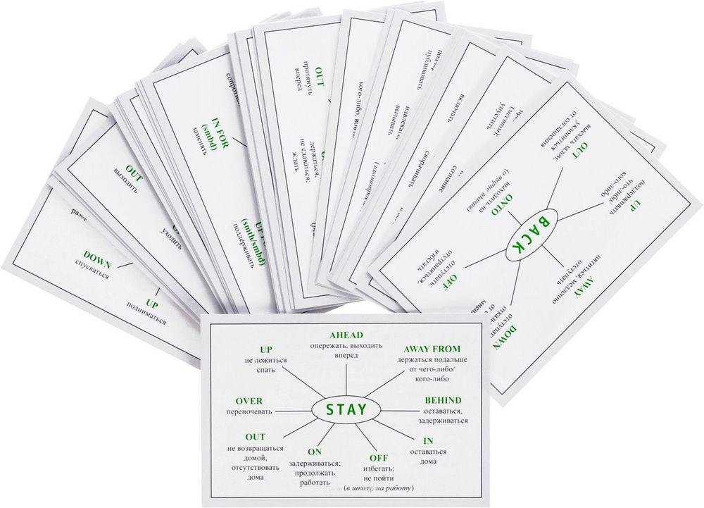 Наглядные карточки с глаголами и предлогами на одной стороне и примерами на другой позволят вам: • расширить лексический запас, не запоминая новые слова, а используя уже известные; • стать своим в компании, где говорят по-английски; • легко переводить тексты и понимать англоязычное кино. Карточки можно использовать на занятиях или повесить на стену и обращаться к ним по мере надобности, пока вы окончательно их не запомните!