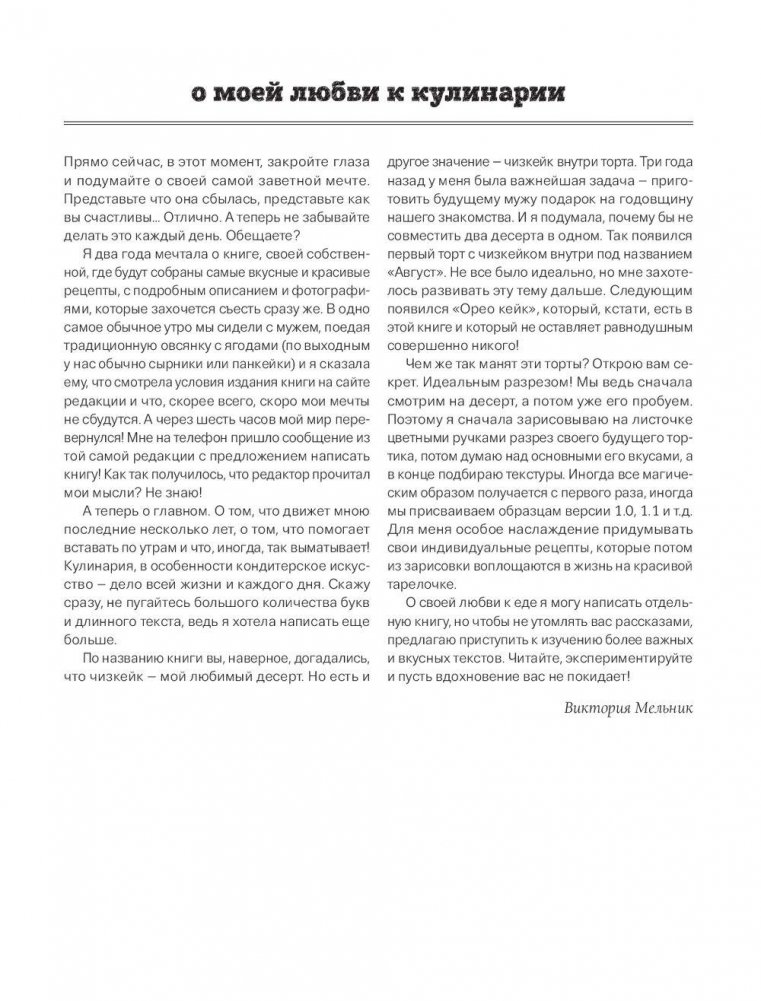 Создайте свою персональную сладкую историю под руководством популярного блогера ВикаБейкери. Роскошные, но доступные рецепты, советы по выбору инвентаря и продуктов, простые шаги к лучшим бисквитам, кремам и муссам. Фото чизкейков и десертов выглядят как прекрасная вдохновляющая кулинарная открытка. И это книга не про обычные торты, где только коржи и крем. Это книга, в которой сочетаются необычные вкусы, текcтуры и техники. Свести любимых с ума вкусом и декором волшебных тортов "как с картинки" — элементарно!
