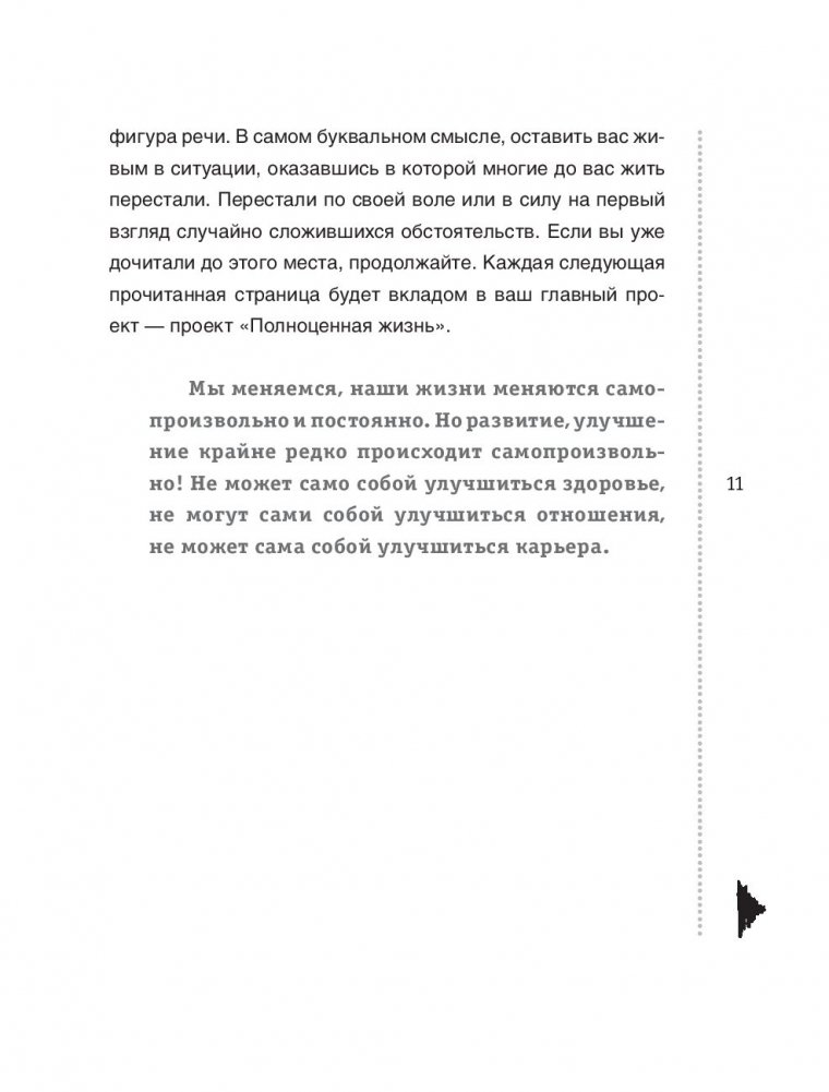 Многие уверены, что успех - это материальное благополучие и на пути к нему нужно обязательно чем-то жертвовать. Большинство из нас посвящают гораздо больше времени планированию своего бизнеса или карьеры, чем планированию собственной жизни. В итоге мы часто видим успешных, но на самом деле сильно уставших и не очень счастливых людей. Поэтому настоящее решение - научиться полноценно жить не вместо бизнеса, а вместе с успешным бизнесом. Полноценная жизнь включает в себя удовлетворение всех основных потребностей человека. Это любовь, дружба, благосостояние, работа, здоровье и хобби. Считается, что удовлетворенность всеми шестью составляющими является показателем полноценности жизни. И основной смысл стратегии полноценной жизни заключается в том, чтобы восстановить утраченный баланс, а затем поддерживать его и наращивать степень удовлетворенности. Разумеется, баланс составляющих восстановить гораздо проще, чем поддерживать его постоянно. Но именно это и является полноценной жизнью - умение держать руку на пульсе и подтягивать те сферы, которые отстают, находить свою точку равновесия, свое счастье. Учиться жить полной жизнью надо здесь и сейчас. Сейчас, когда мечты не теряют свою актуальность и мы еще можем сами выстроить свою стратегию счастья. Ведь именно счастье - основная категория баланса полноценной жизни. И именно о нем эта книга.