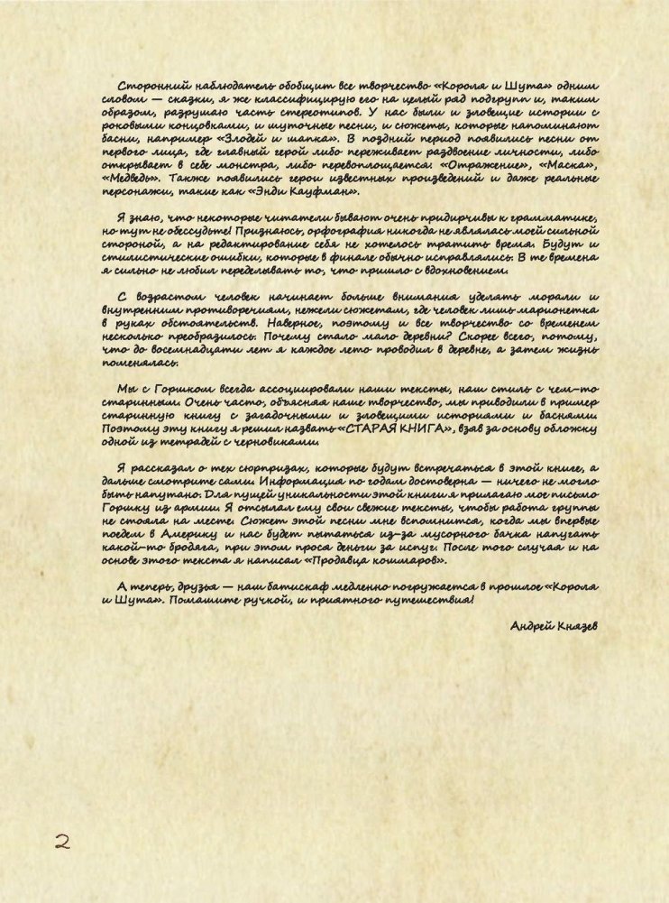Андрей Князев - один из лидеров легендарной питерской рок-группы « Король и Шут », автор музыки и всех текстов, а так же, оформитель альбомов коллектива, ныне возглавляющий свою группу « КняZz », решил поделиться с поклонниками своими старыми черновиками. Магия личного пространства творца, первые версии любимых текстов, наброски - все это будет доступно в непосредственных копиях рукописных страниц, которые Андрей лично собрал в книгу.