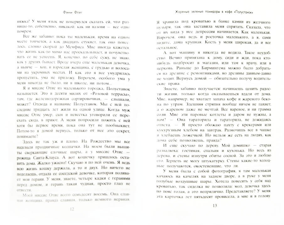"Жареные зеленые помидоры" Фэнни Флэгг практически после первого же издания на русском языке стал культовой книгой в России. За десять лет роман переиздавался много раз, но и сегодня его популярность чрезвычайно велика. «Жареными зелеными помидорами» зачитывается уже второе поколение читающей публики. Роман ставят в один ряд с великими американскими книгами – с "Убить пересмешника" и "Гелькебери Финном", – и уже одно упоминание книги Флэгг в таком ряду свидетельствует о ее силе. И уж совершенно точно: "Жареные зеленые помидоры" – это классика американской и мировой литературы. Если приблизить роман Фэнни Флэгг, то наверняка можно услышать чей-то смех, плач, разговоры, шум поезда, шорох листвы, звяканье вилок и ложек. Прислушайтесь к звукам, пробивающимся через обложку, и вы узнаете историю одного маленького американского городка, в котором, как и везде в мире, переплелись любовь и боль, страхи и надежды, дружба и ненависть. История эта будет рассказана с такой искренностью, что запомнится на долгие годы, и роман Фэнни Флэгг станет одной из самых любимых книг – как стал он для очень многих во всем мире. Ибо великий роман Фэнни Флэгг и есть сама жизнь. Фэнни Флэгг — из тех немногих писателей, чьи мудрые и поэтичные книги оставляют долгое и изумительно приятное послевкусие. Обаятельная, смешная и щемяще-проникновенная проза Фэнни Флэгг — универсальное средство от хандры. С наслаждением вживаясь в уютный мир ее романов, сводя короткое знакомство с живыми и узнаваемыми персонажами, мы получаем отличный шанс на время забыть о тревогах и трудностях, окружающих нас в реальной жизни.