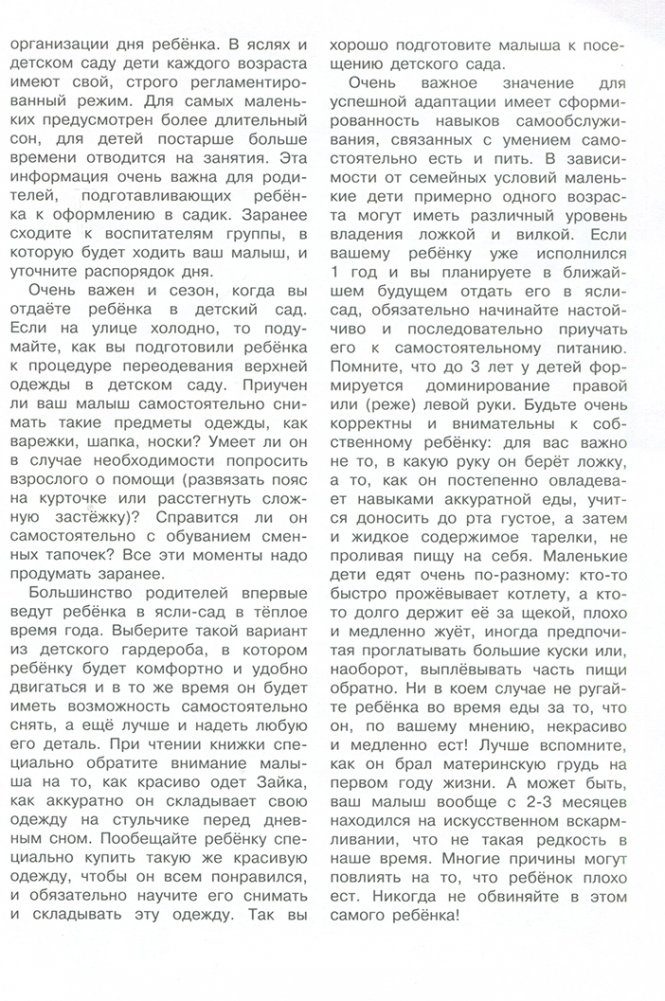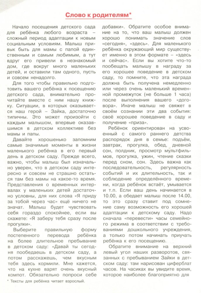 Для того чтобы правильно подготовить вашего ребенка к посещению детского сада, внимательно прочитайте вместе с ним нашу книжку. Ситуации, в которых оказывается наш герой - Зайка, достаточно типичны. Это может произойти с каждым малышом, впервые оказавшемся в детском коллективе без мамы и папы. Будьте терпеливы в воспитании малыша и внимательны к любым сложностям, которые встретятся на его пути в детский сад. Желаем вашему крохе успехов в детском саду.