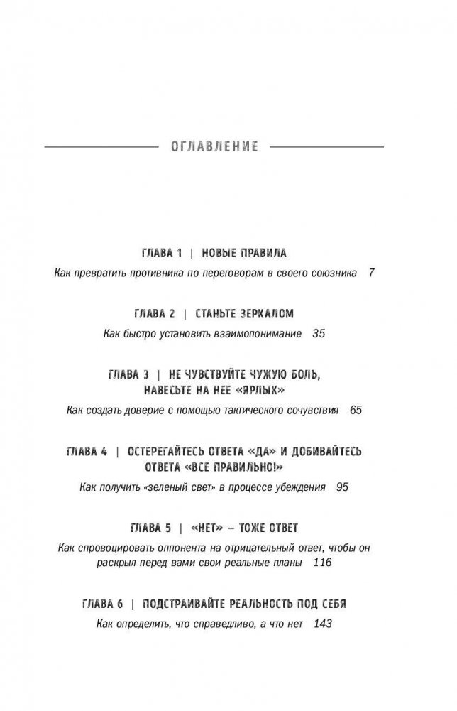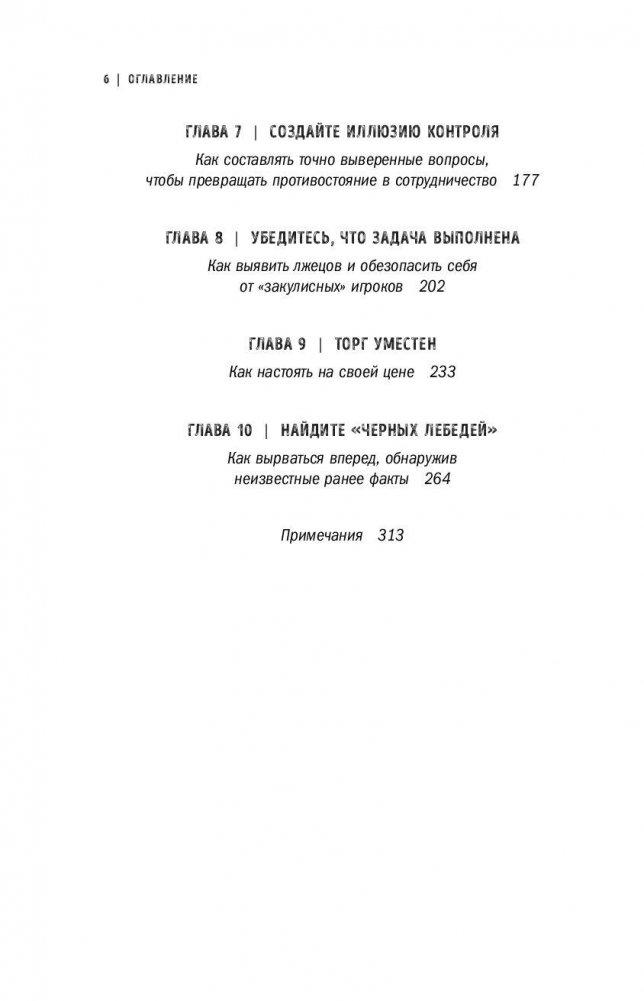 Переговоры без конфликтов, стресса и ненужных уступок — вот что предлагает эта книга. И не важно, пытаетесь ли вы сбить цену на ремонт стиральной машины или заключаете многомиллионную сделку. 9 методов Криса Восса, выдающегося специалиста ФБР по спасению заложников, работают во всех случаях. Они не просто позволяют добиваться своего без испытаний для нервной системы — они помогают сохранять дружеский тон и позитивный настрой в самых сложных ситуациях. Книга также выходит под названием "Переговоры без компромиссов. Веди переговоры так, словно от них зависит твоя жизнь" и "Никаких компромиссов. Беспроигрышные переговоры с высокими ставками".